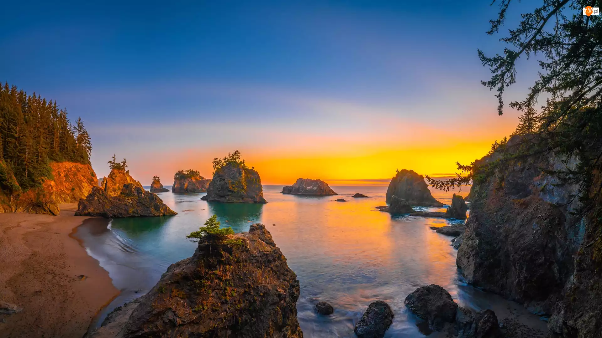 Stany Zjednoczone, Secret Beach, Oregon, Wybrzeże, Zachód słońca, Morze, Skały, Plaża, Drzewa