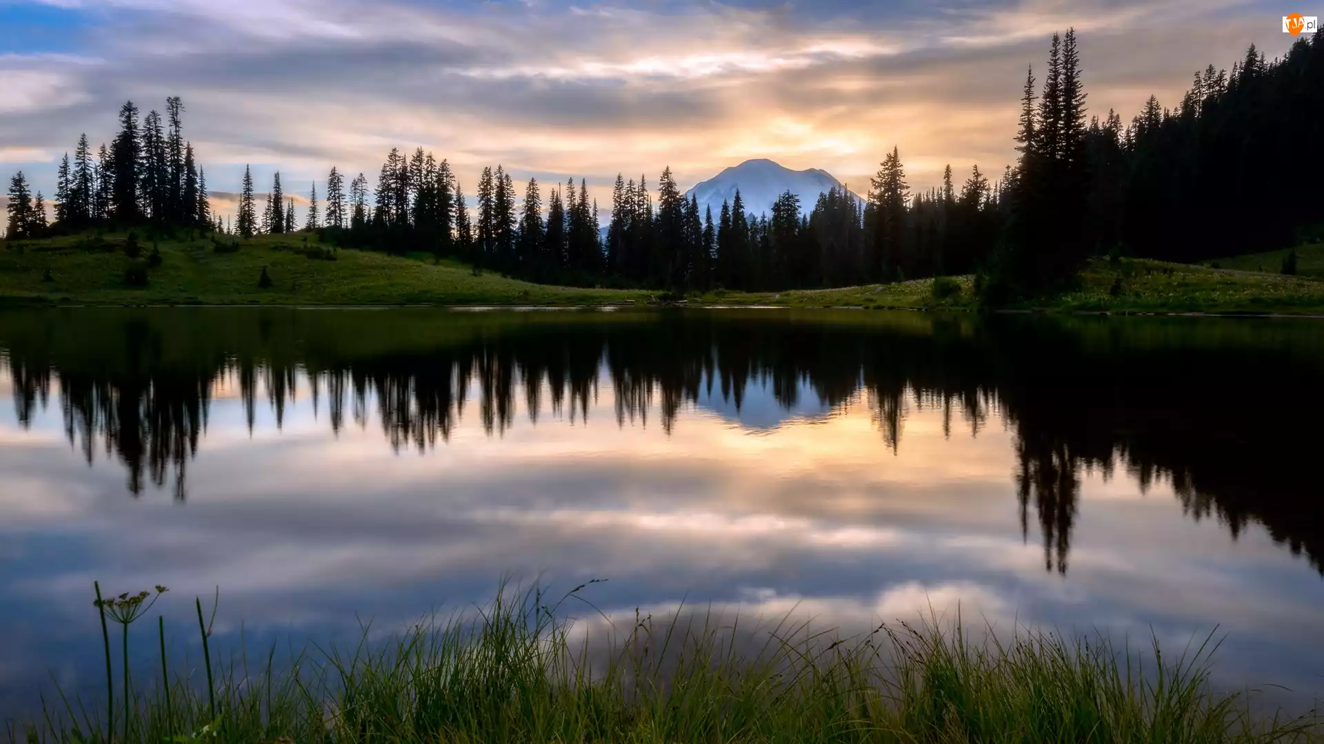 Stany Zjednoczone, Tipsoo Lake, Stan Waszyngton, Wschód słońca, Chmury, Park Narodowy Mount Rainier, Stratowulkan Mount Rainier, Jezioro, Drzewa