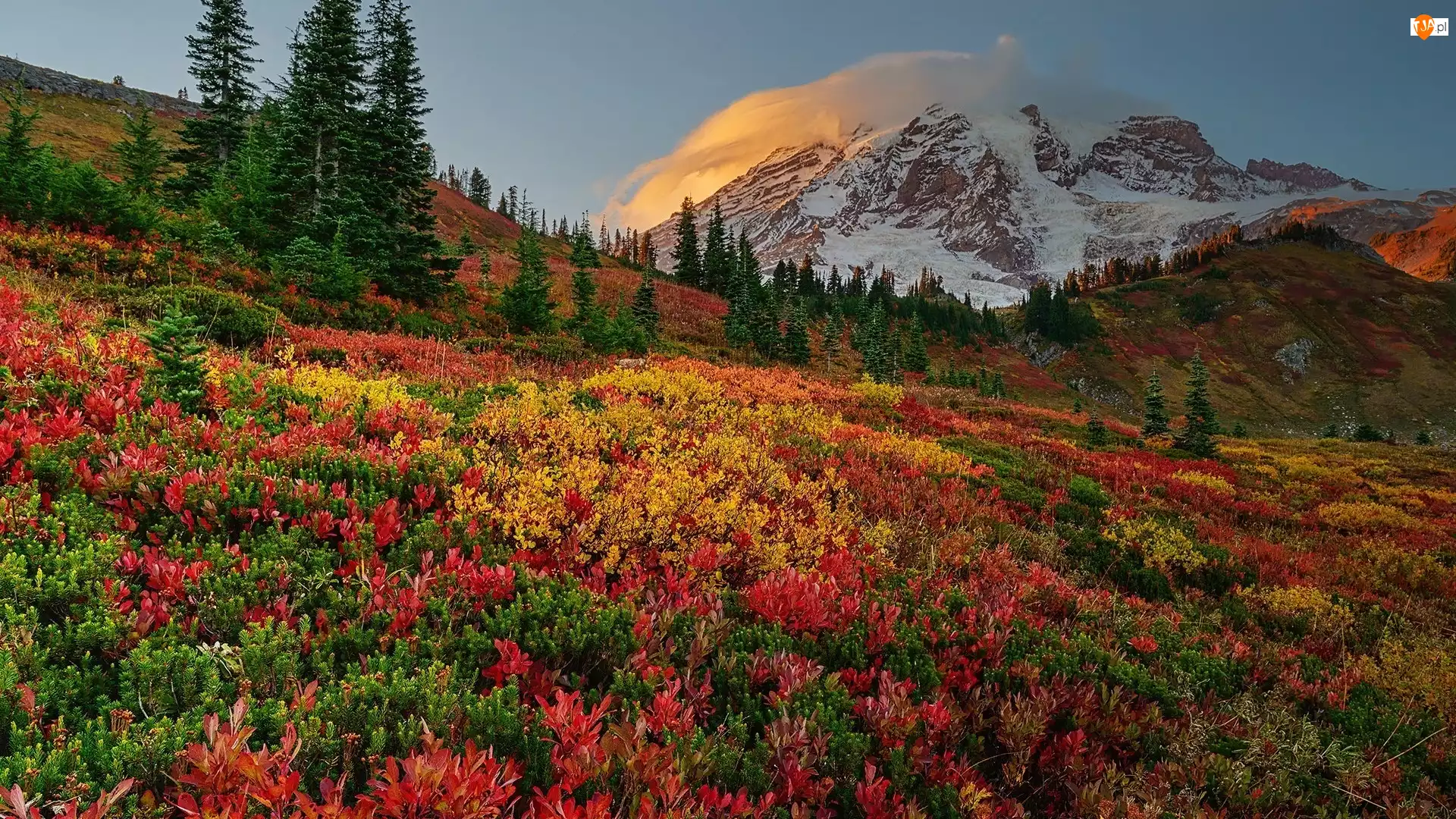 Stany Zjednoczone, Wulkan, Waszyngton, Roślinność, Park Narodowy Mount Rainier, Mount Rainier, Drzewa, Góra, Kolorow