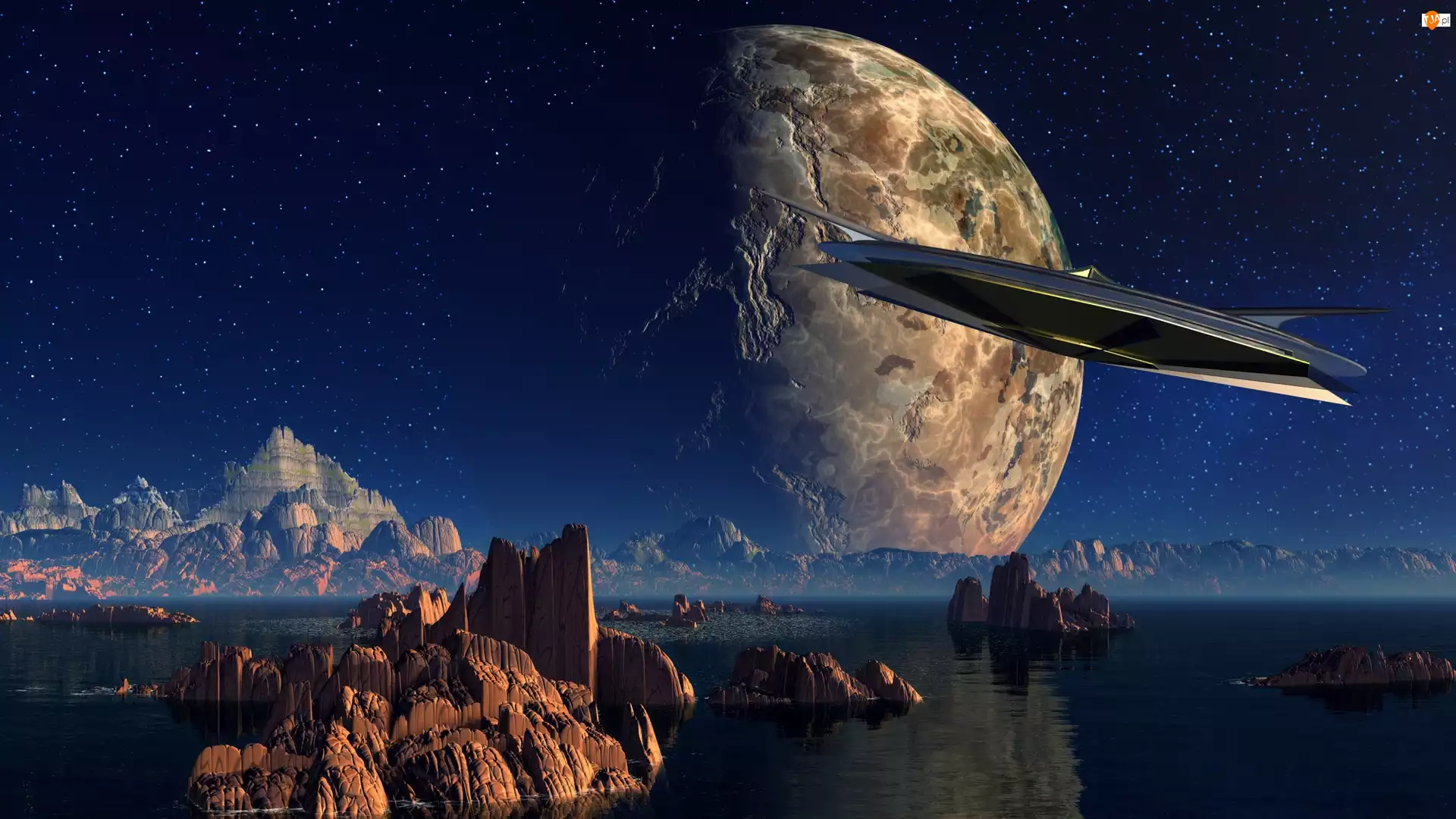 Statek kosmiczny, Grafika, Fantasy, Skały, Kosmos, Planety, Góry, 3D