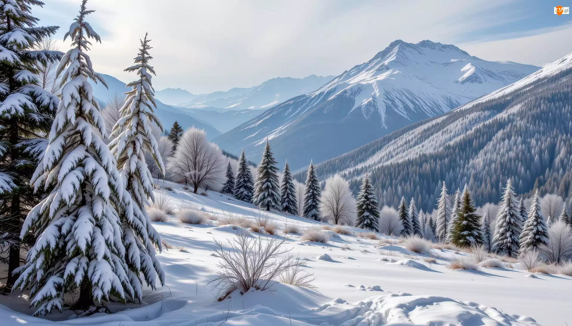 Stok, Grafika AI, Drzewa, Zima, Góry