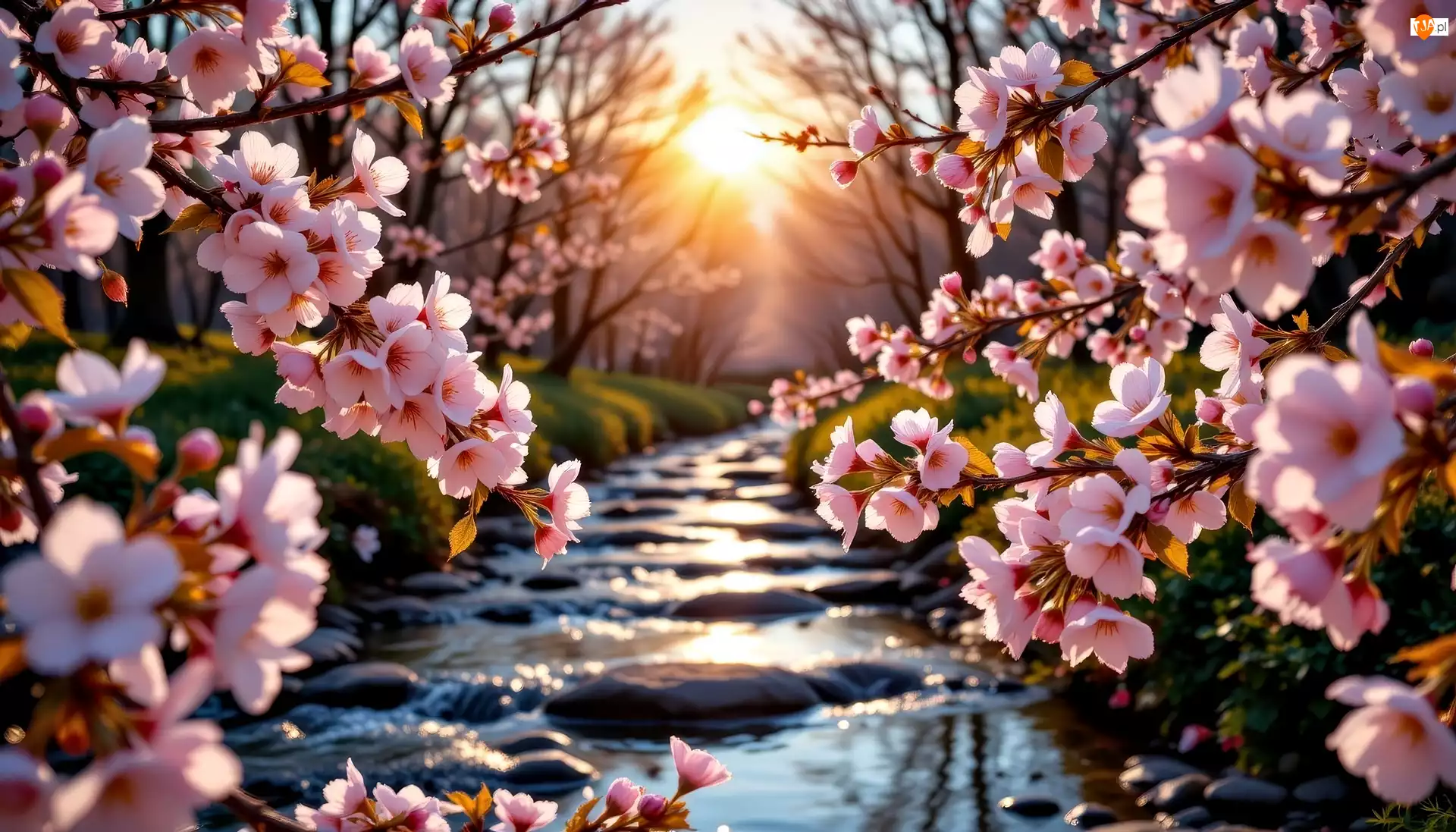 Strumień, Wiosna, Różowe, Zachód słońca, Kwitnące, Kwiaty, Grafika AI, Gałęzie