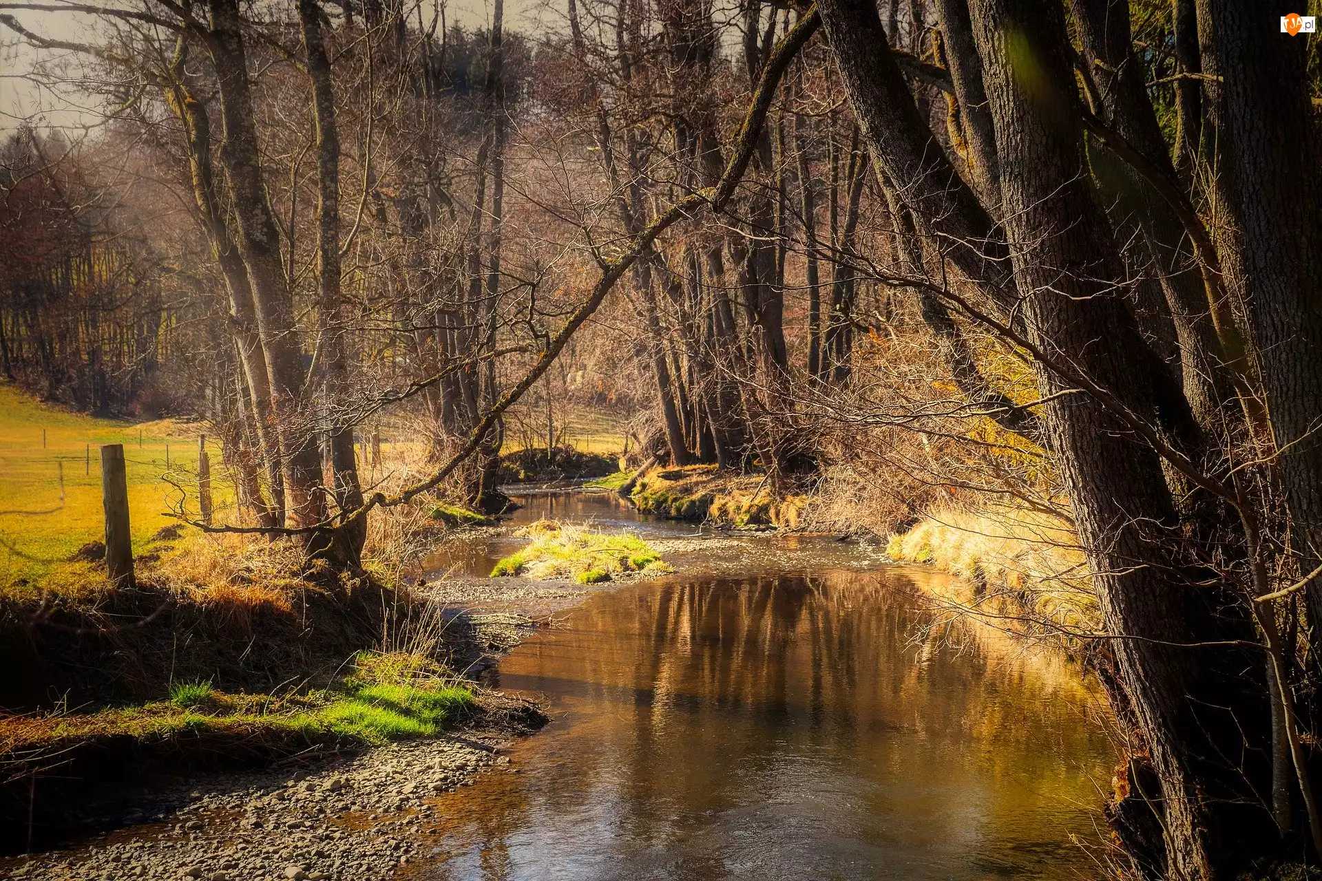Strumień, Jesień, Las, Drzewa, Rzeka, Bezlistne