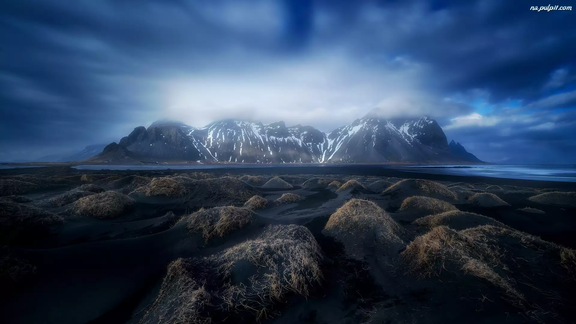 Islandia, Góry, Góra Vestrahorn, Chmury, Sucha, Kępy, Morze, Trawa, Mgła, Plaża Stokksnes