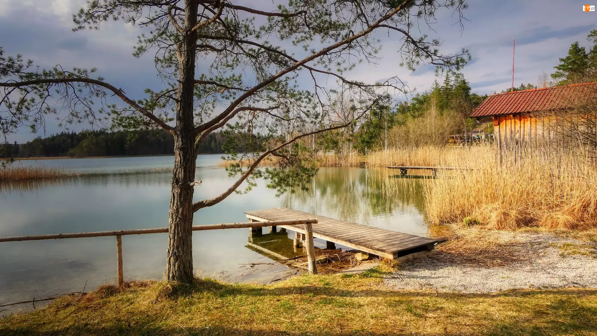 Dom, Jezioro, Pomost, Drzewa