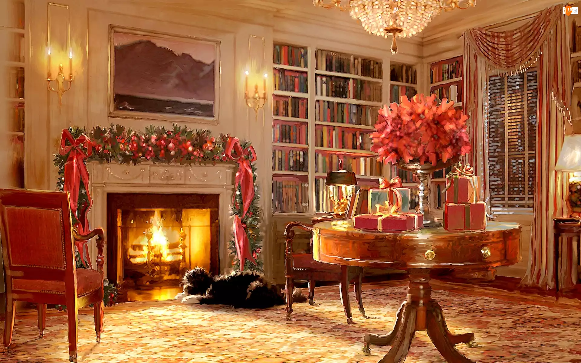 Wnętrze, Kominek, Malarstwo Reprodukcja obrazu, Pokój, Świąteczne, Dekoracje, Pies