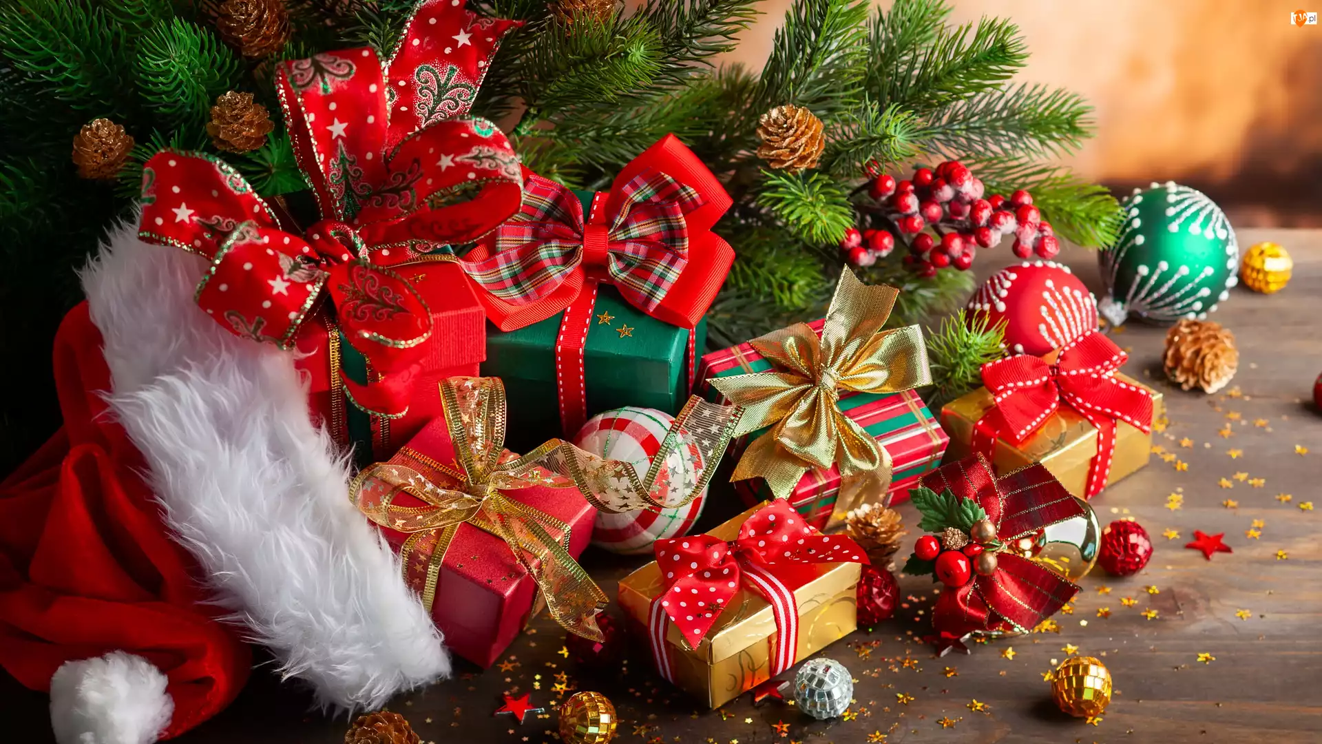 Prezenty, Świąteczne, Bombki, Mikołaja, Gałązki, Czapka