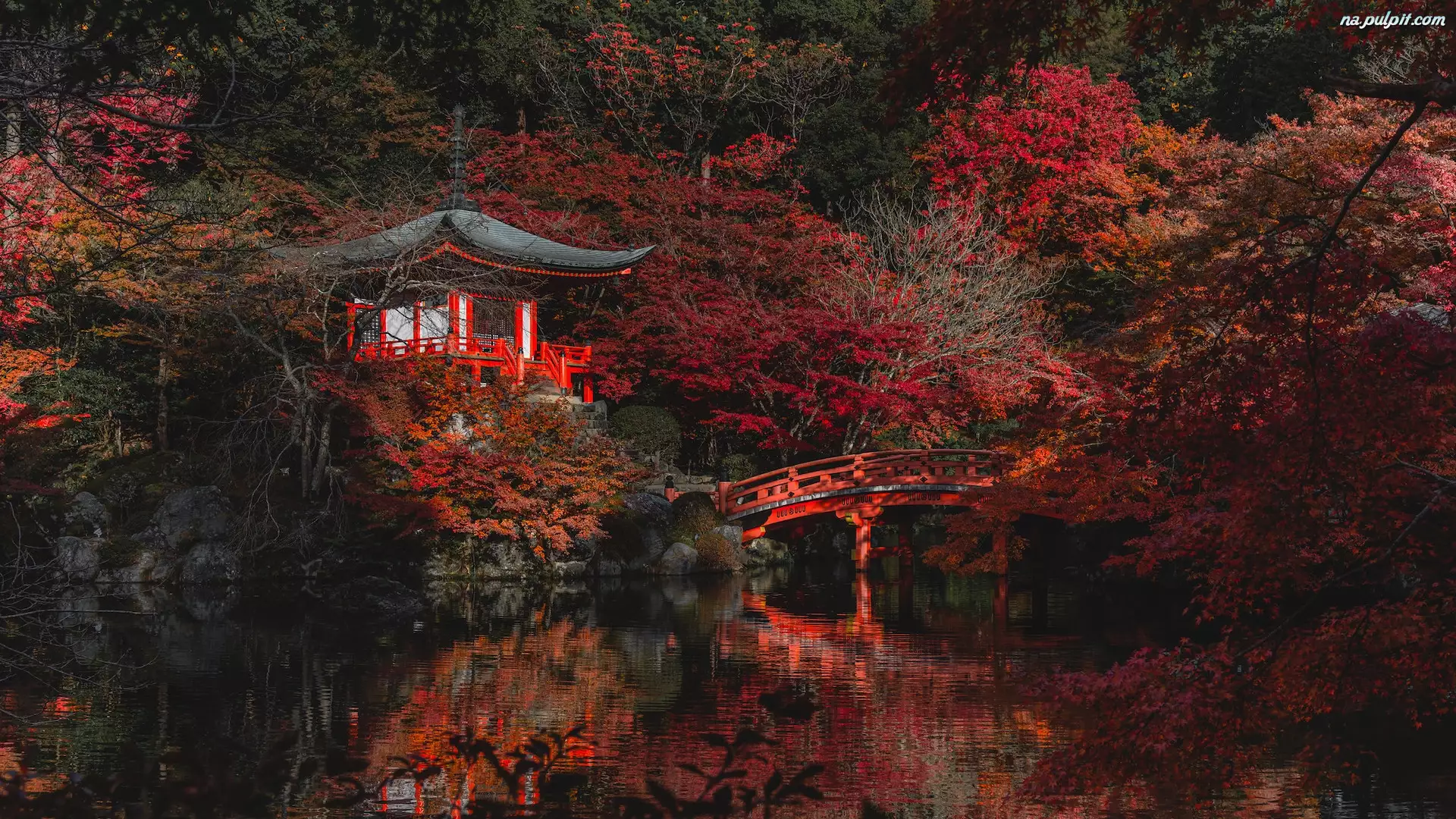 Odbicie, Kioto, Jesień, Drzewa, Mostek, Świątynia, Bentendo Temple, Japonia, Kompleks Daigo-ji