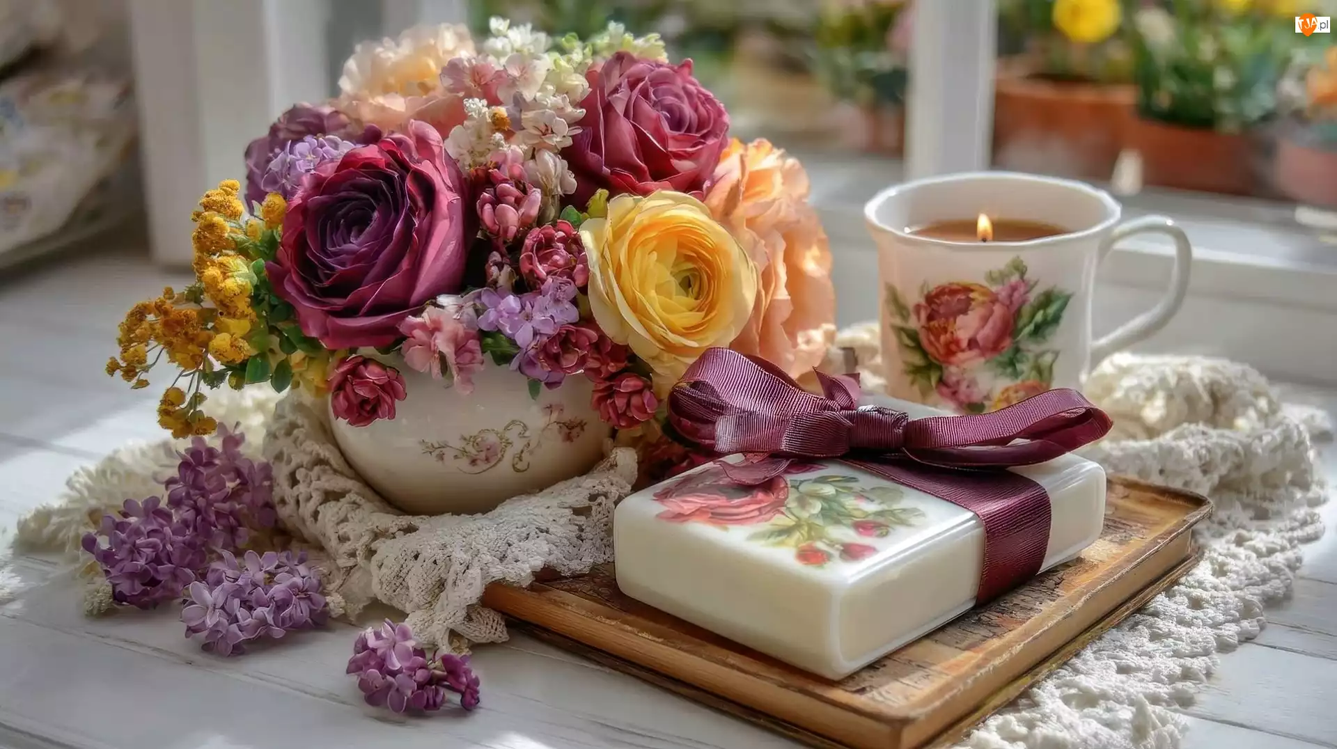Świeca, Kompozycja, Wazon, Kwiaty, Prezent