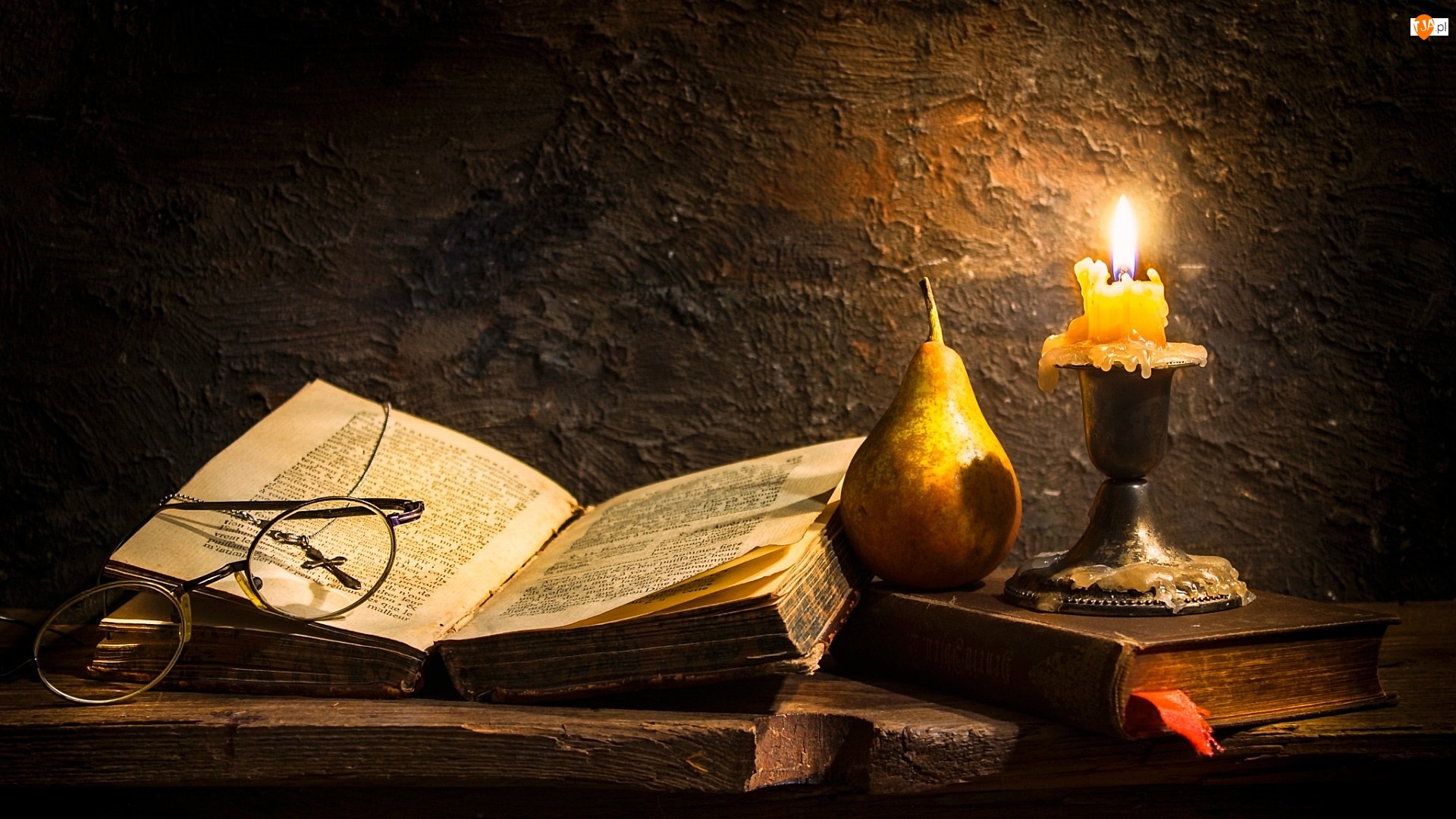 Świeca, Modlitewnik, Kompozycja, Gruszka, Okulary, Książka