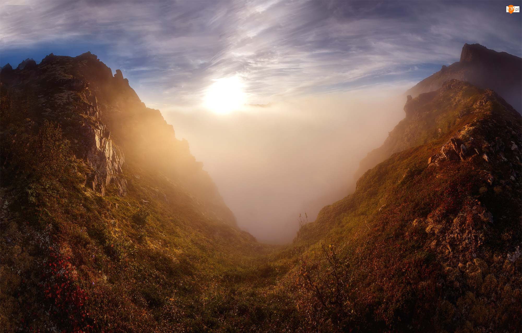 Góry, Mgła, Norwegia, Przebijające słońce, Wyspa Senja, Dolina