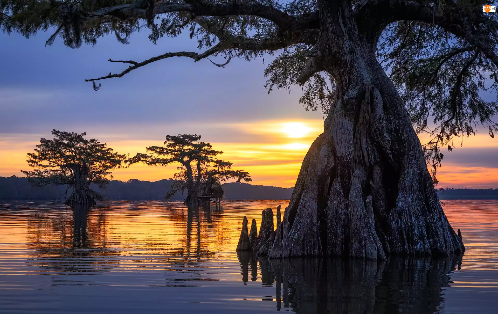 Szerokie, Wschód słońca, Drzewa, Jezioro, Pnie