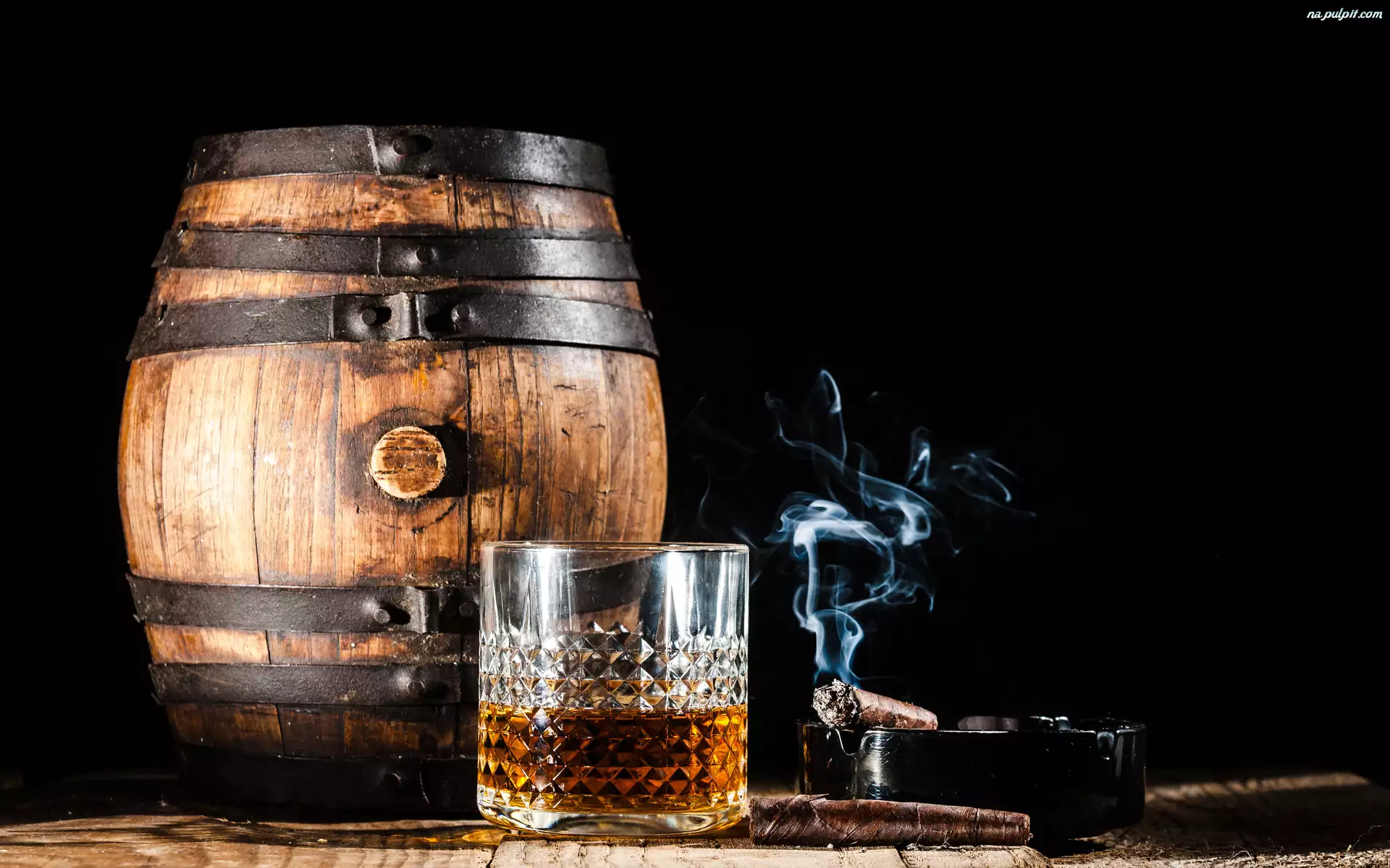 Beczka, Alkohol, Dym, Kompozycja, Cygaro, Popielniczka, Szklanka