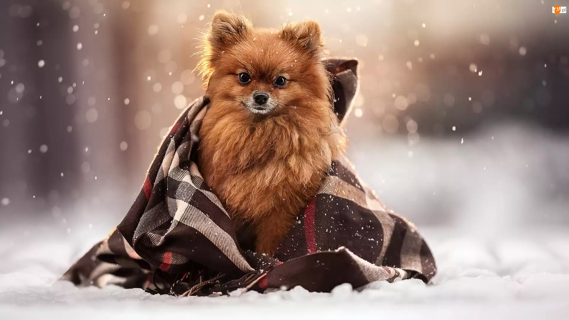 Szpic miniaturowy w kocu na śniegu