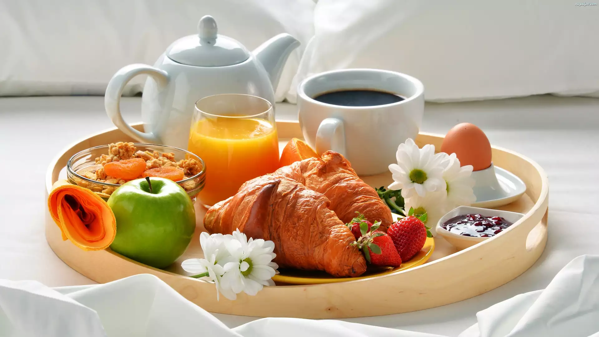 Kawa, Rogale, Taca, Śniadanie, Kwiaty, Jabłko, Sok pomarańczowy