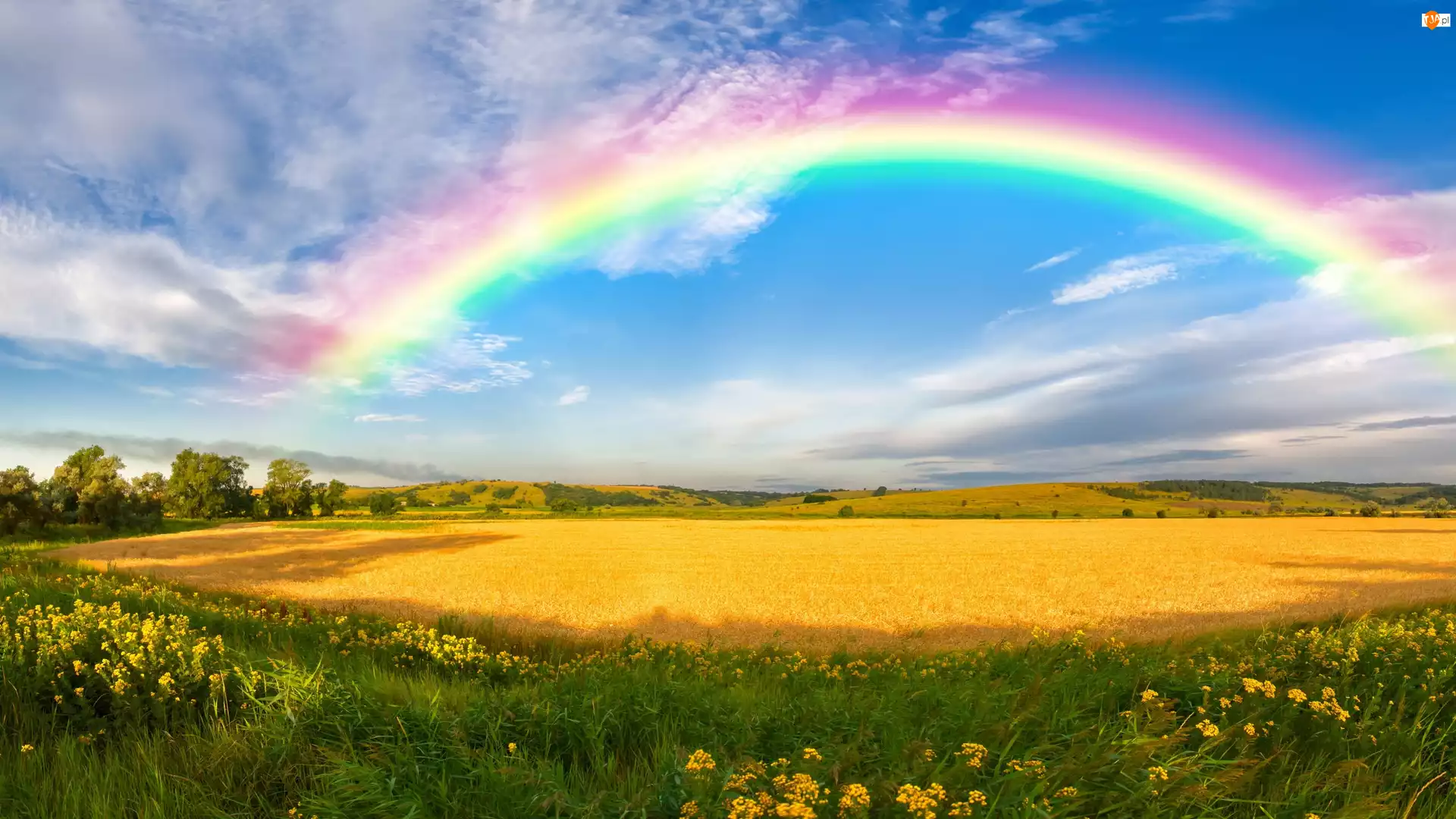 Tęcza, Drzewa, Pola, Wzgórza