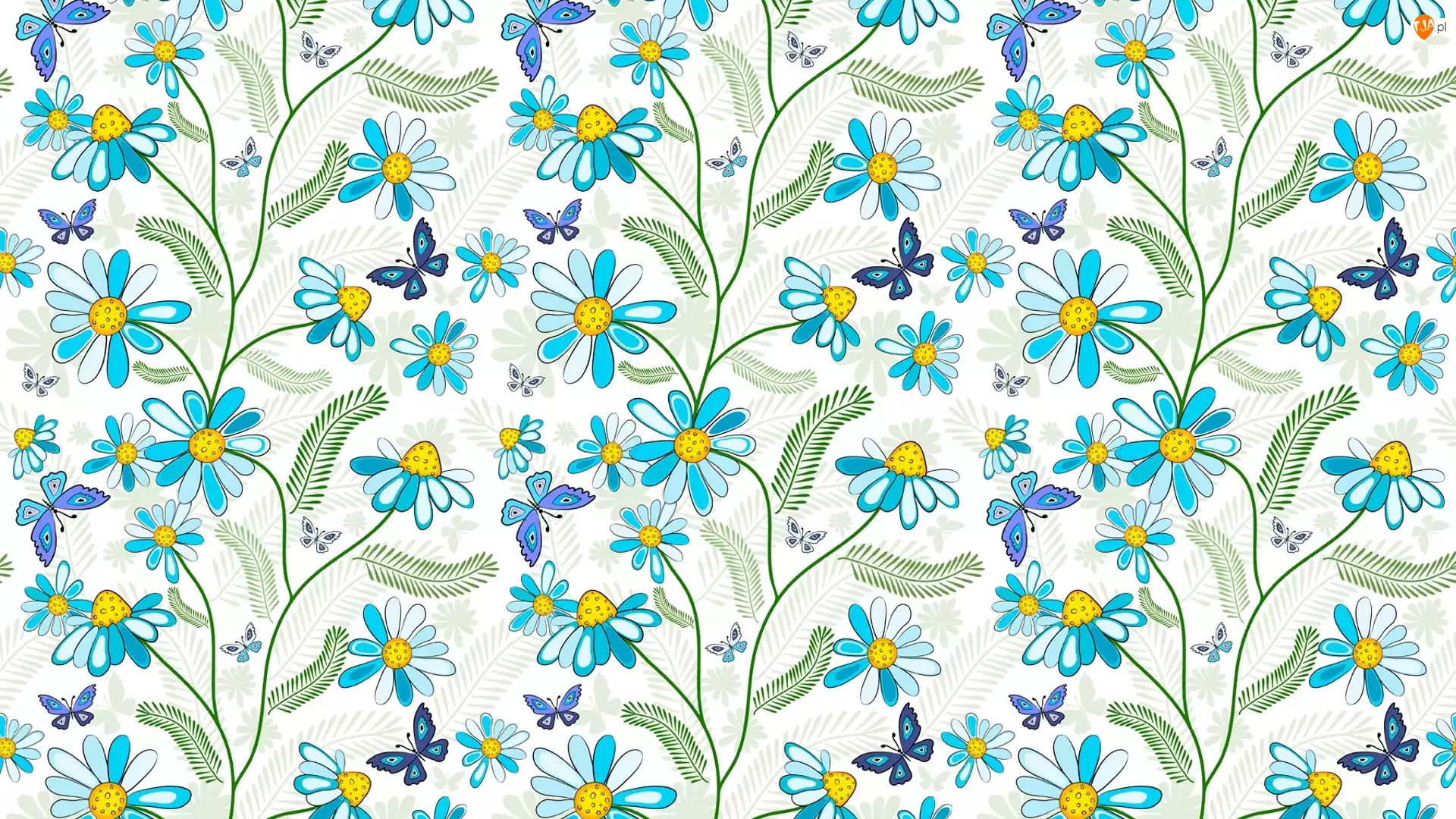 Niebieski, Tekstura, Kwiaty, Motylki, Wzór