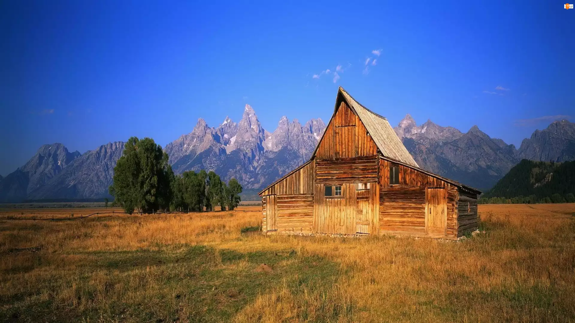 Trawa, Góry, Drewniany, Domek, Drzewa
