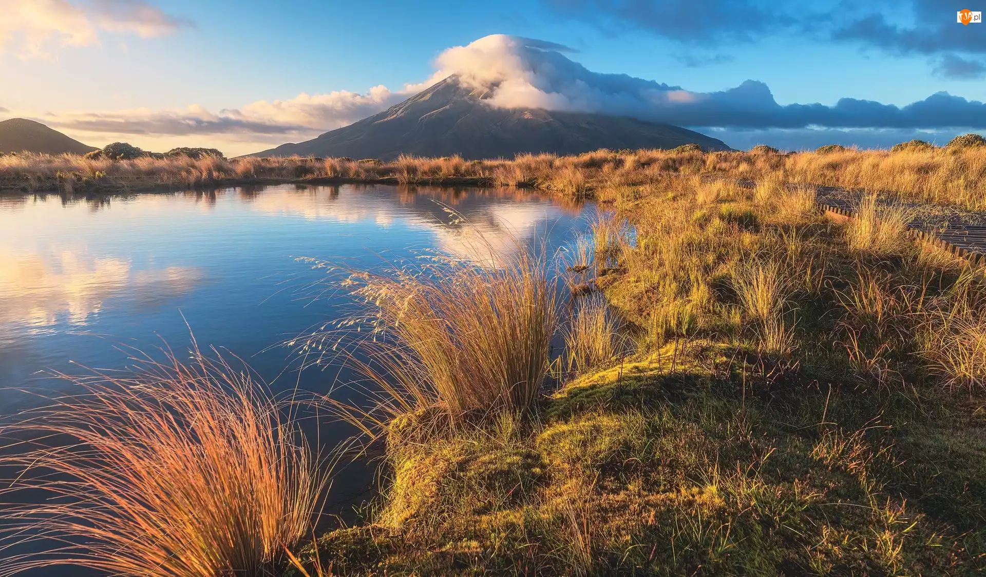 Trawa, Nowa Zelandia, Park Narodowy Egmont, Chmury, Góra, Staw Pouakai, Odbicie, Taranaki