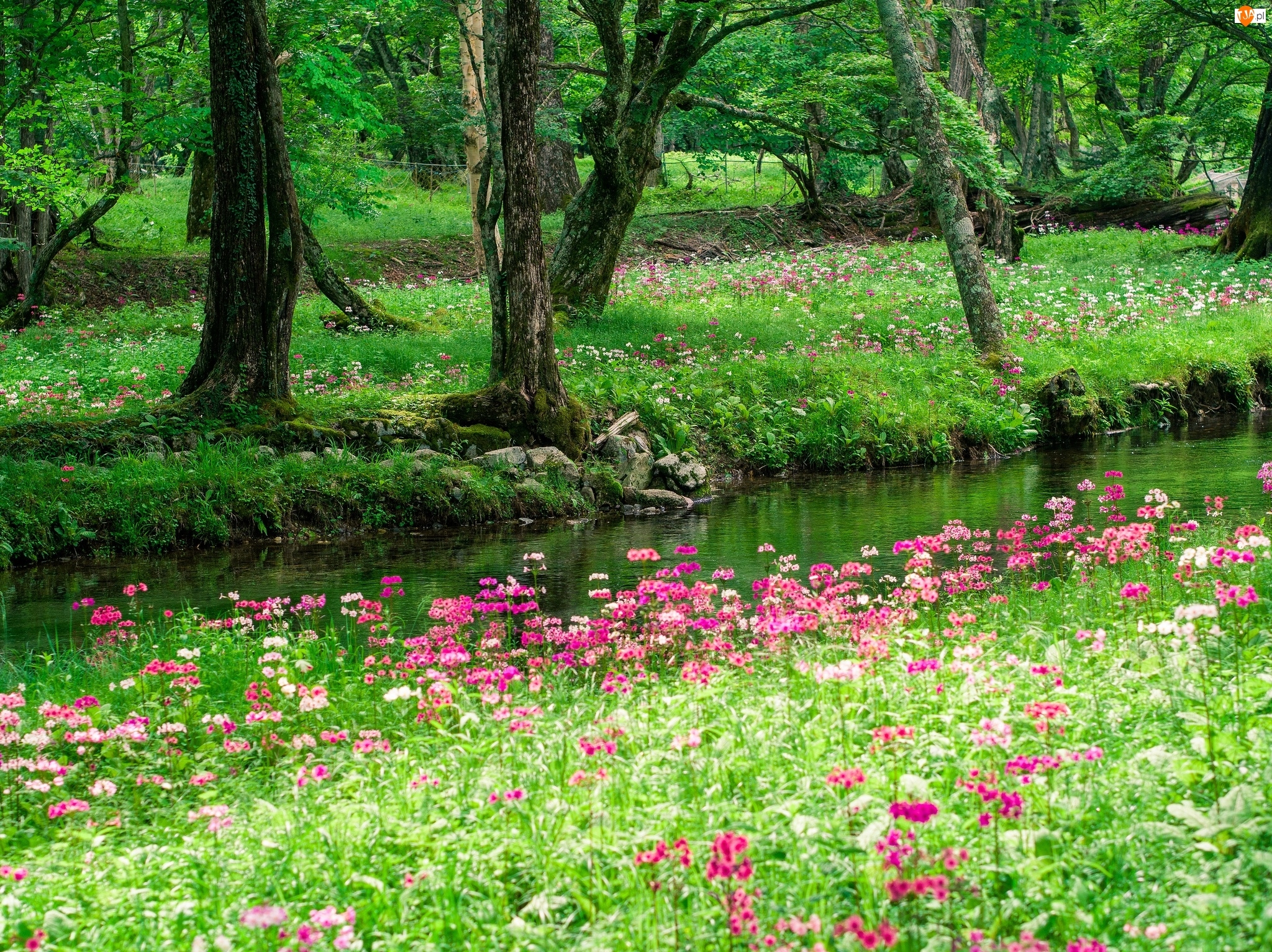 Trawa, Różowe, Park, Kwiaty, Drzewa, Rów