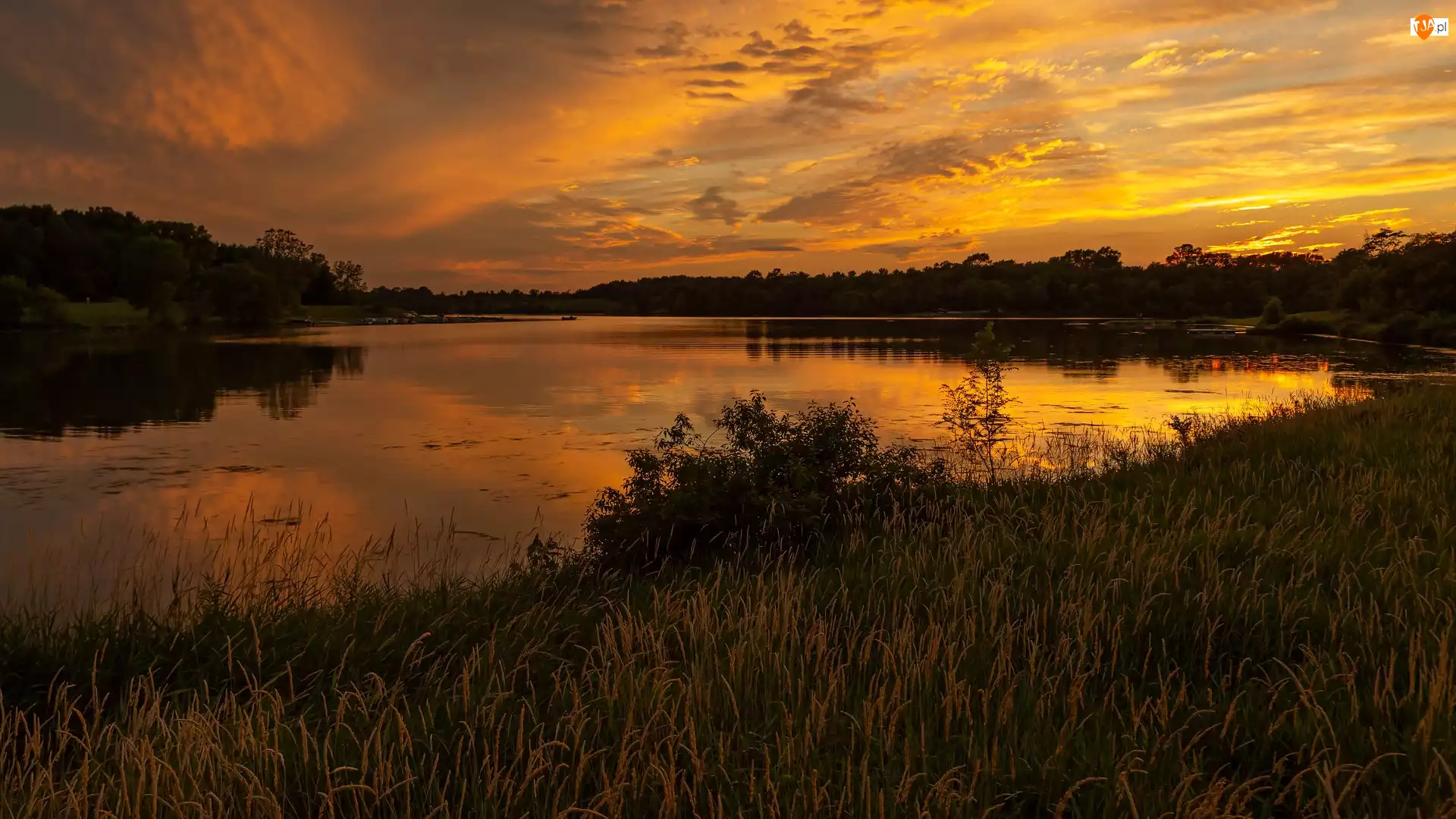 Tagi: Trawa Zachód słońca Rzeka Drzewa