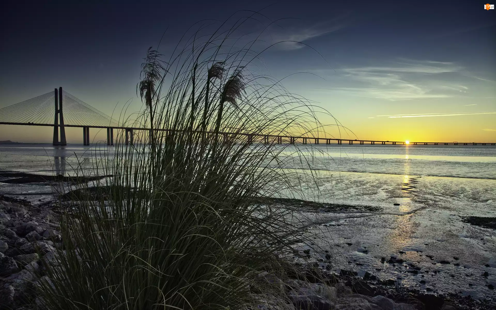 Trawy, Zachód, Rzeka, Słońca, Most, Kamienie