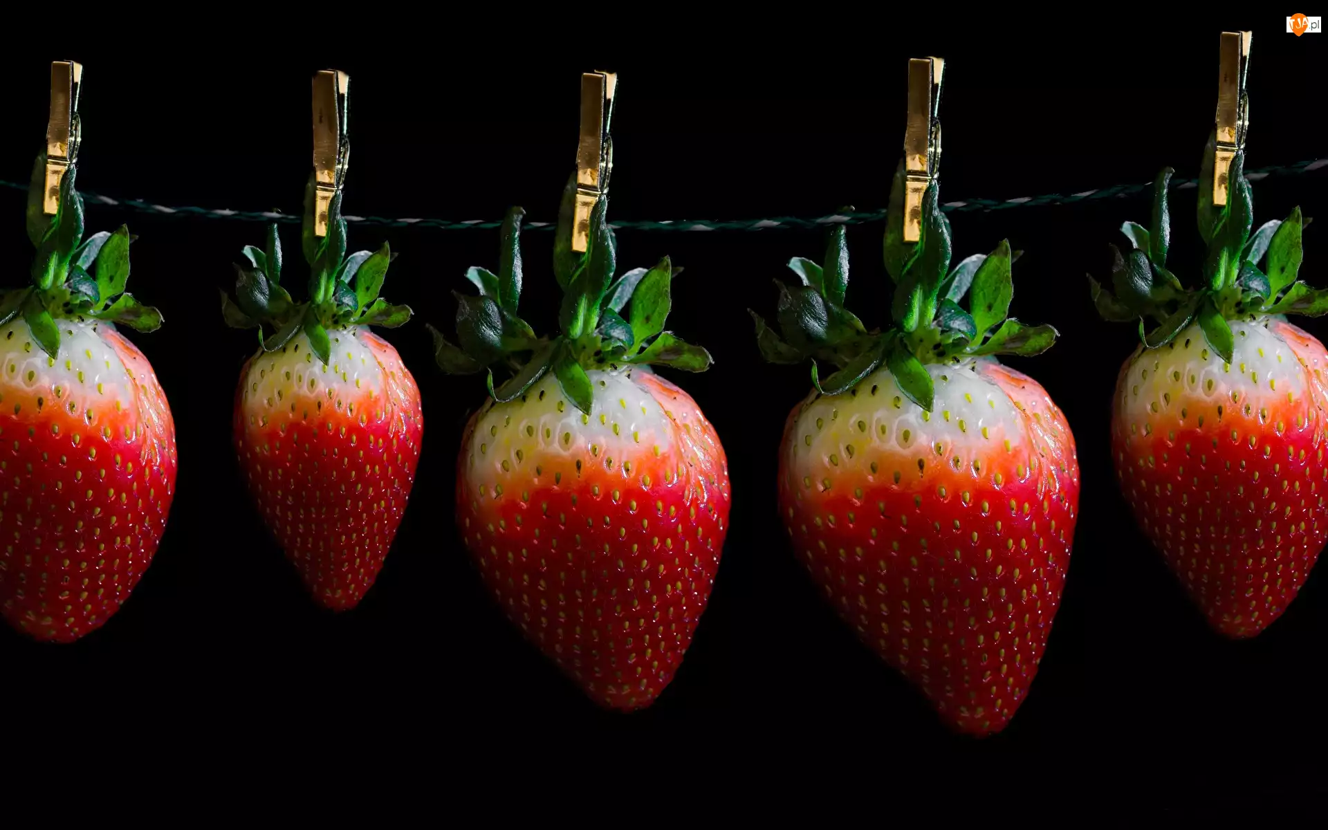 Sznurki, Czarne tło, Truskawki, Owoce, Klamry