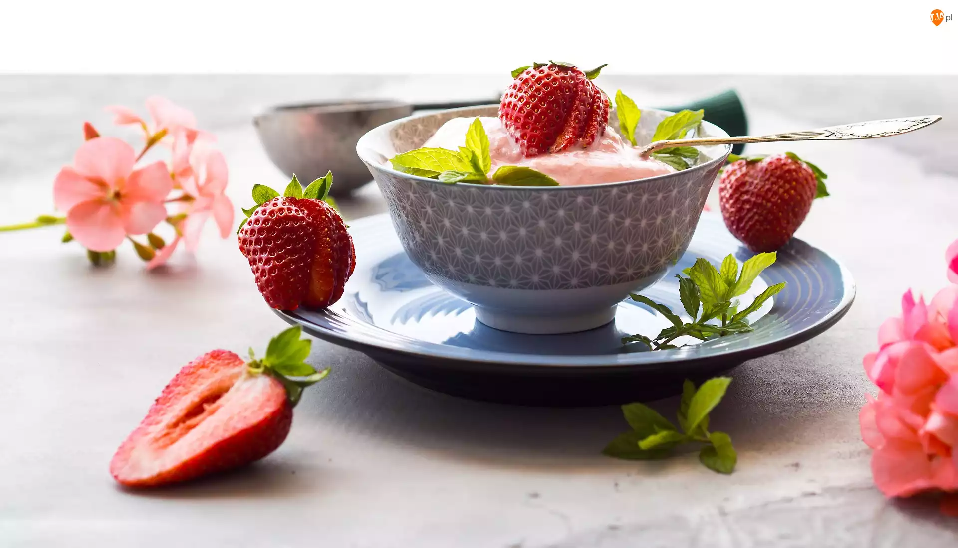 Truskawki, Pucharek, Listki, Kwiaty, Lody, Mięty, Pelargonia, Łyżeczka