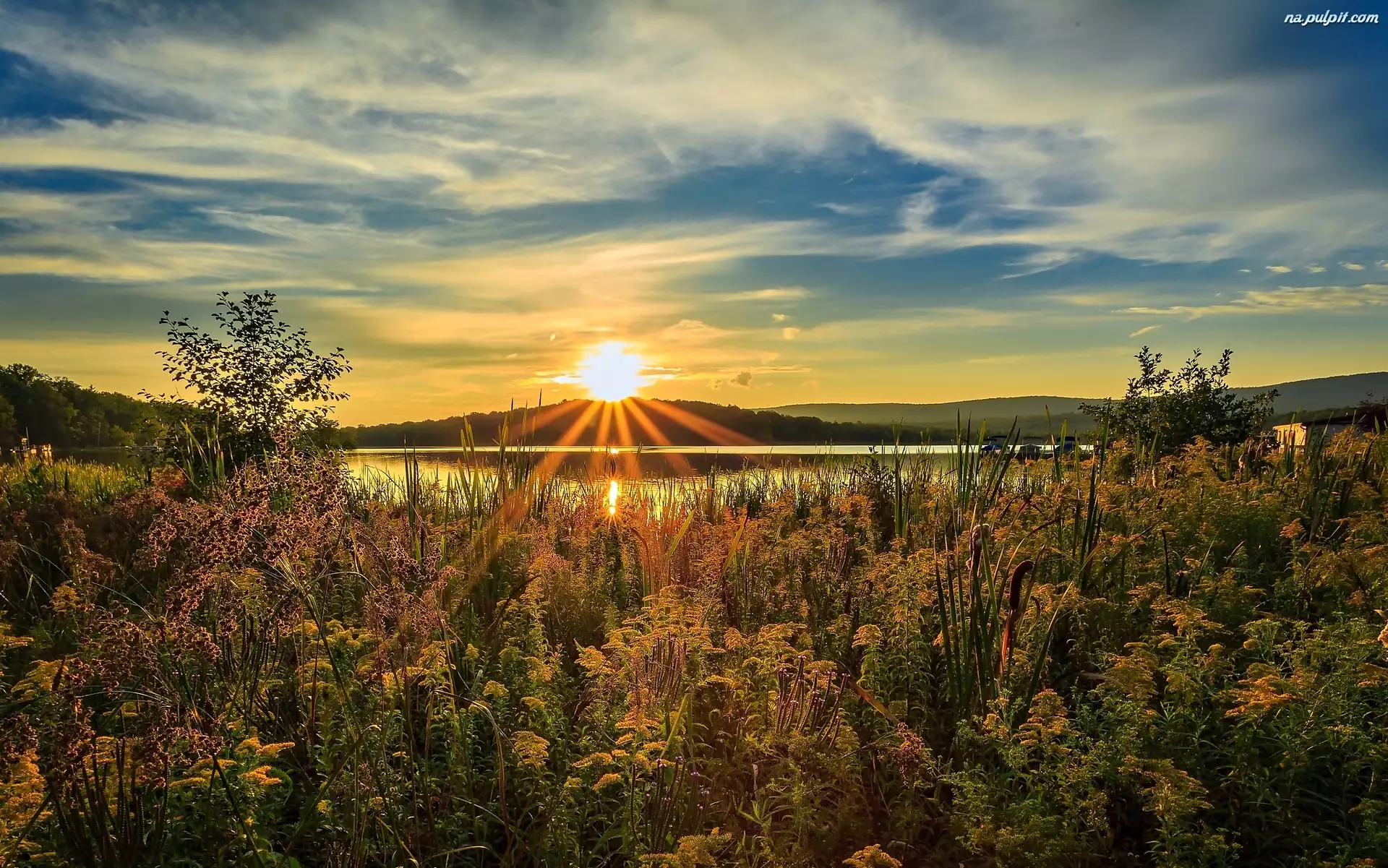 Trzciny, Wschód Słońca, Rzeka, Wzgórza, Zaroś