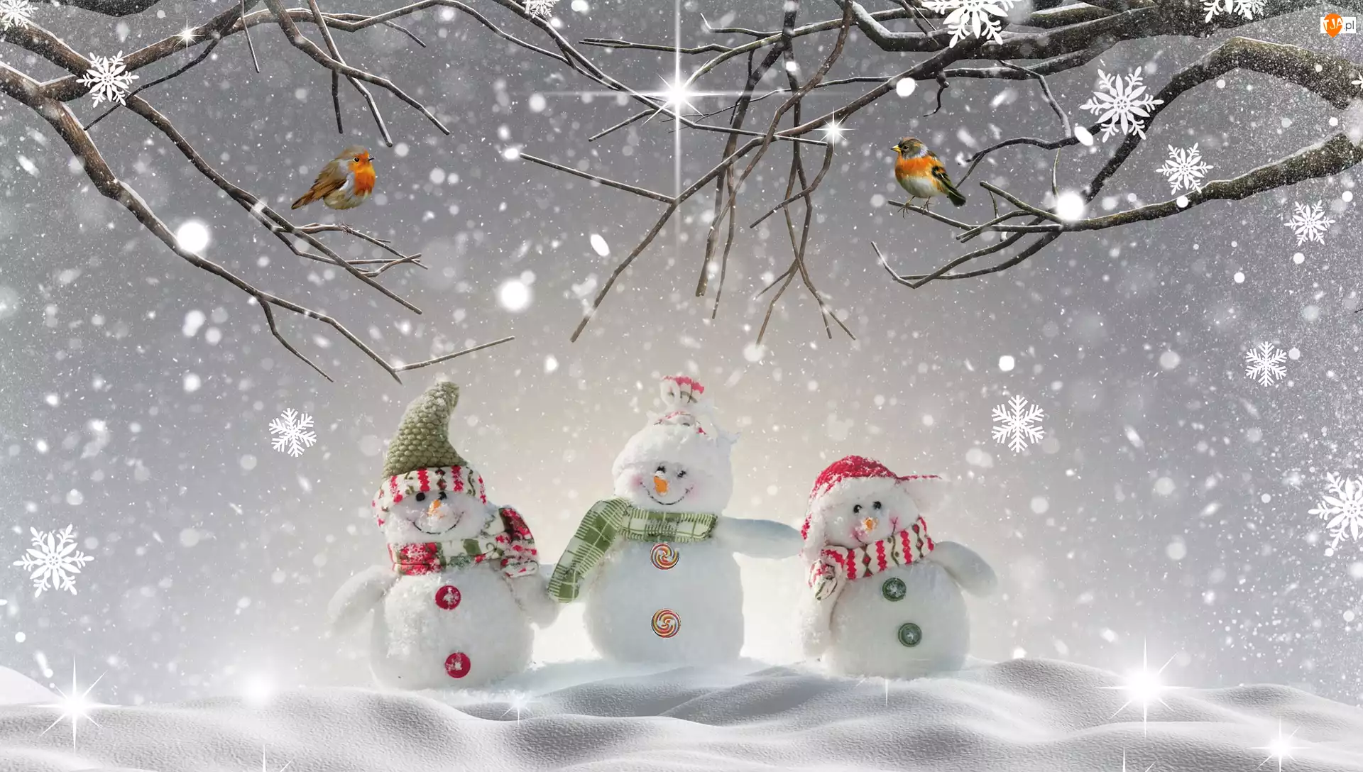 Ptaki, Zima, Bałwanki, Gałęzie
