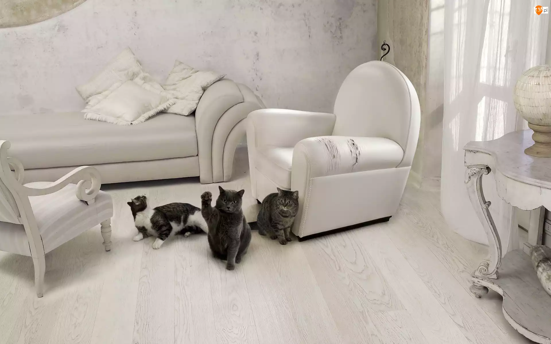 Trzy, Meble, Koty, Podrapane