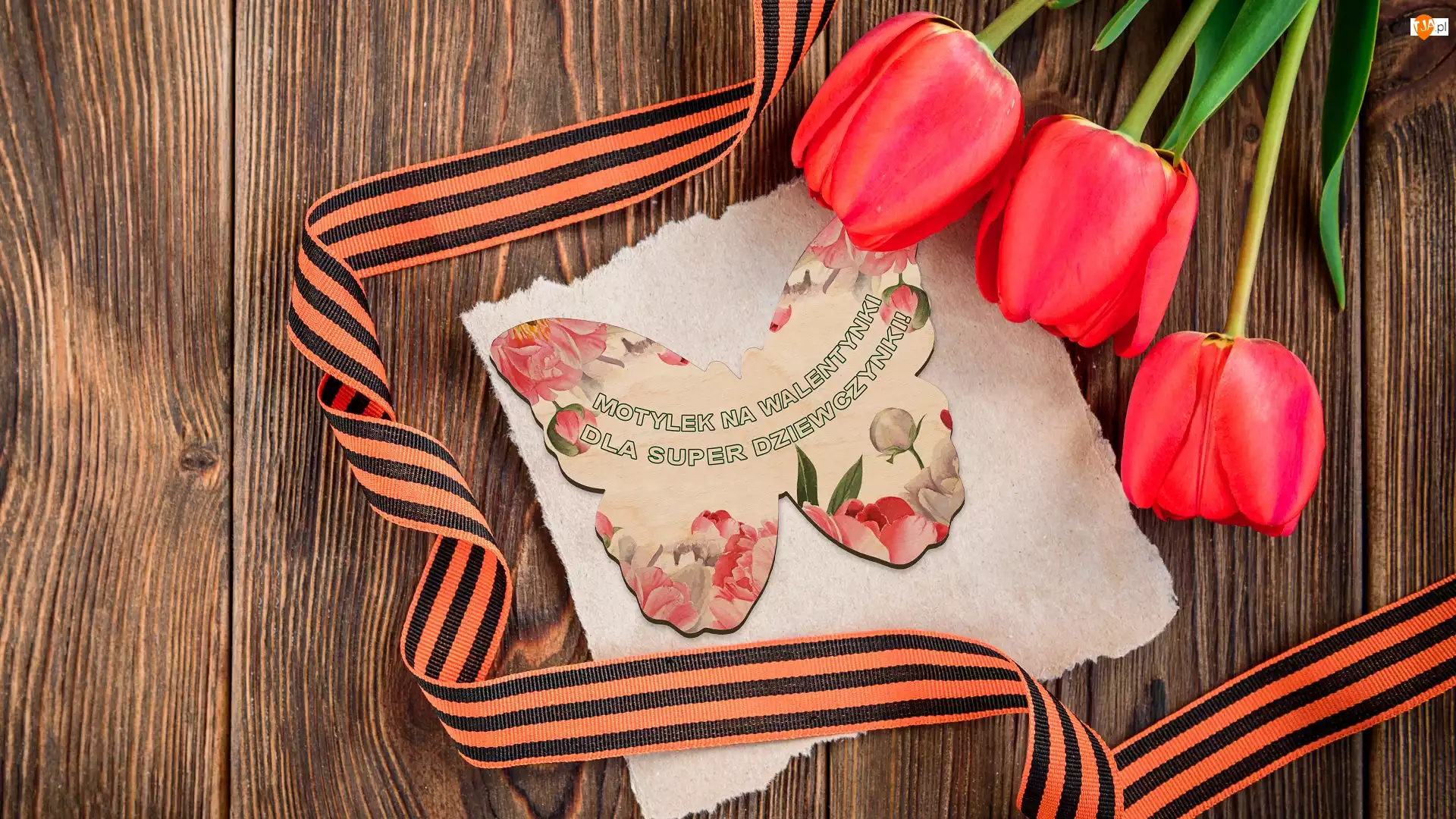 Tulipany, Motylek, Deski, Walentynki, Wstążka, Życzenia, Kartka
