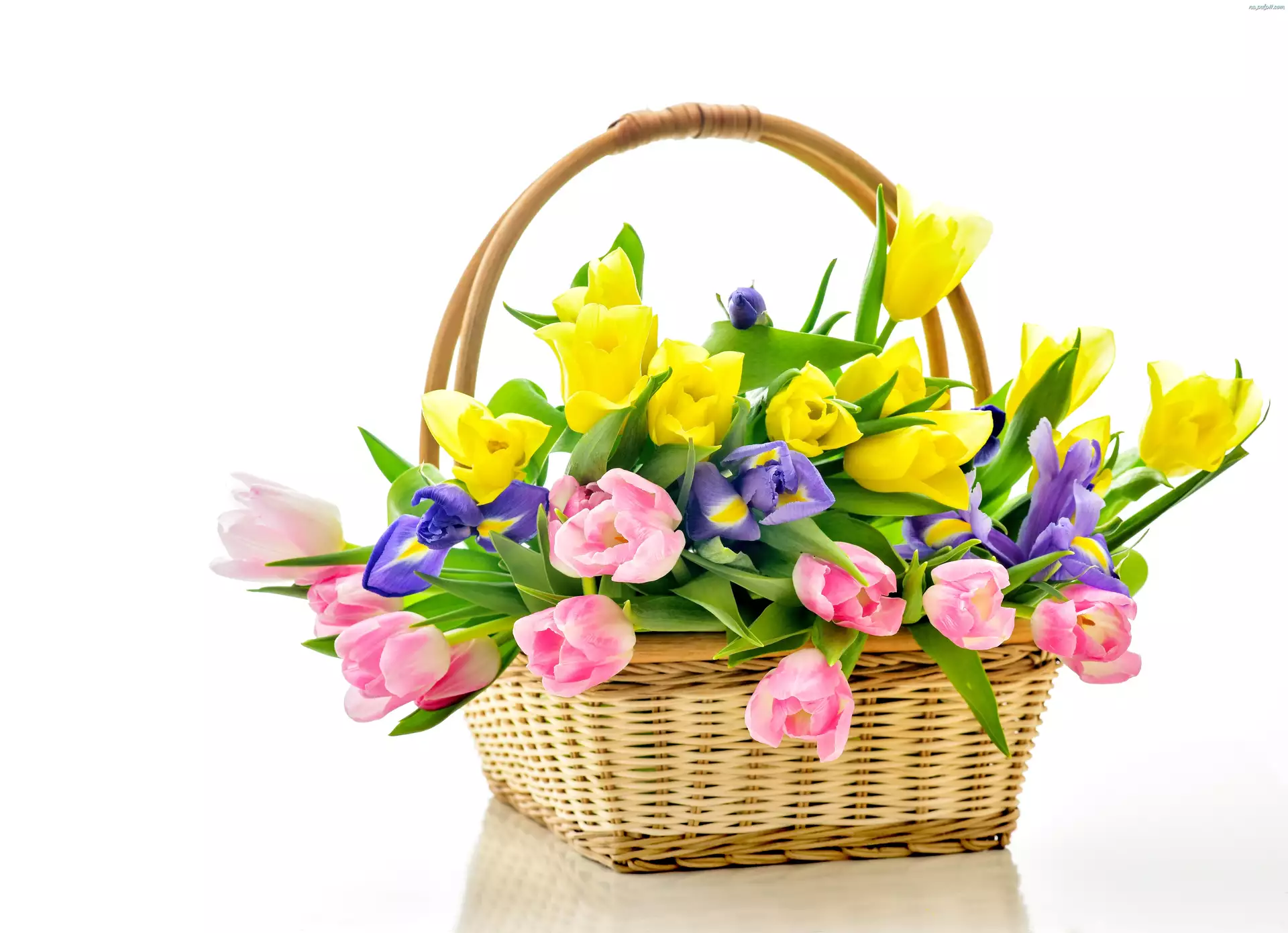 Tulipany, Bukiet Kwiatów, Irysy, Kosz