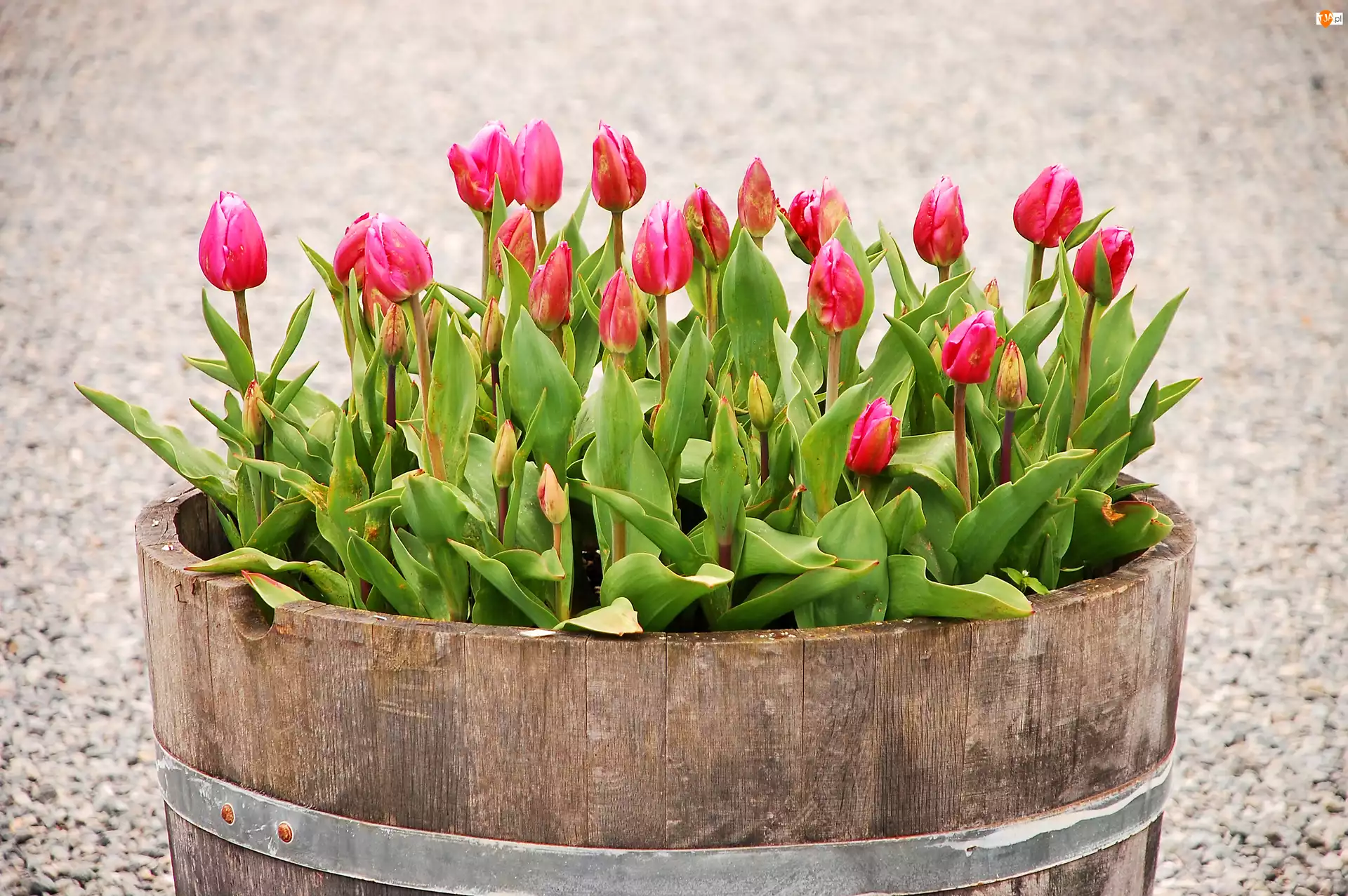 Tulipany w drewnianej beczce