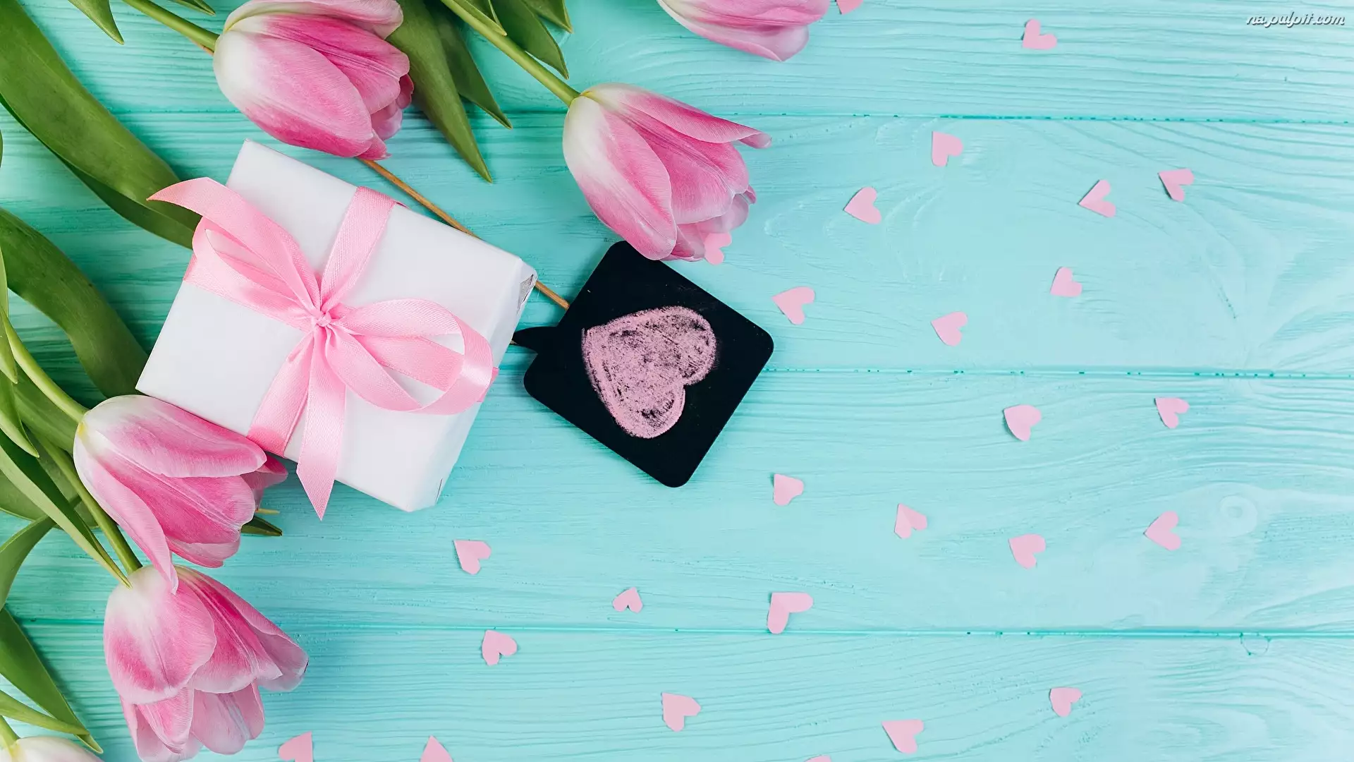 Tulipany z prezentem i serduszkami