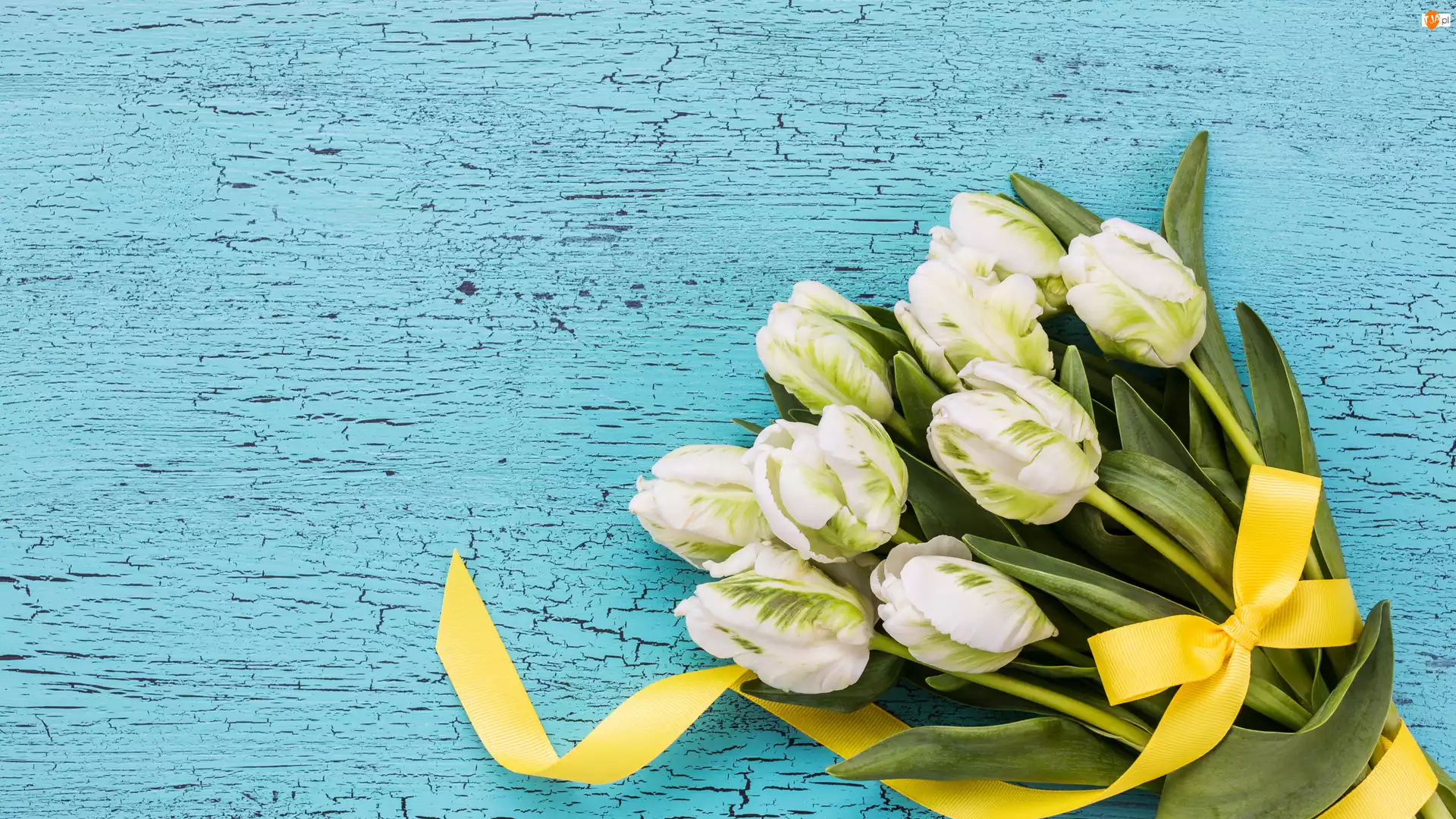 Bukiet, Wstążka, Tulipany papuzie, Białe, Żółta