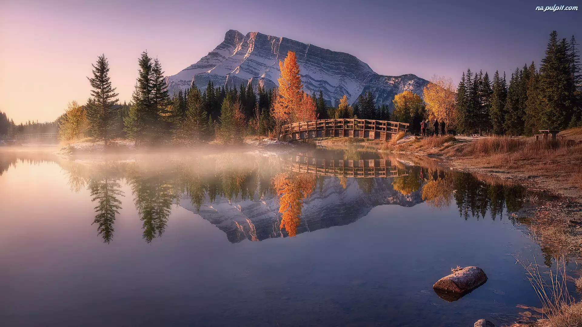 Two Jack Lake, Odbicie, Mgła, Drzewa, Góra Mount Rundle, Alberta, Mostek, Park Narodowy Banff, Las, Jezioro, Kanada