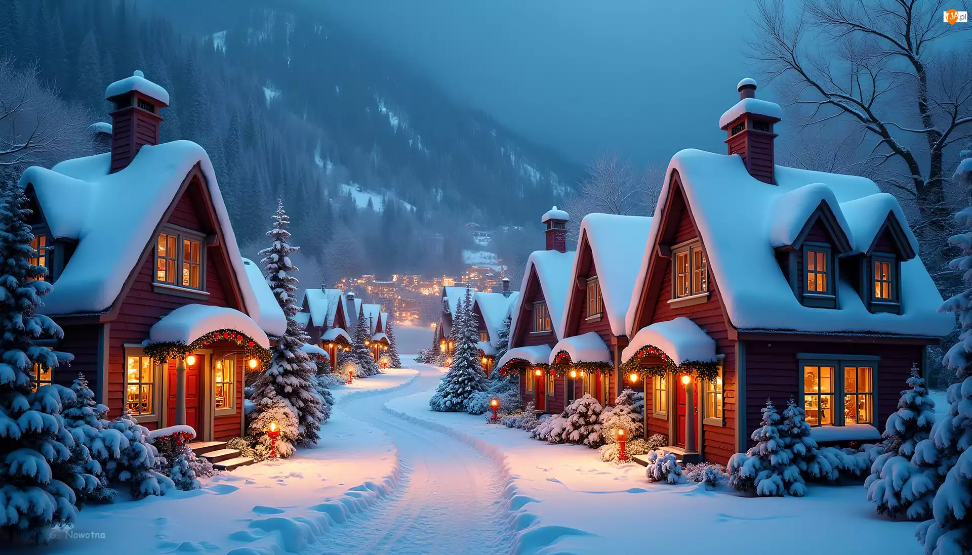 Ulica, Domy, Śnieg, Grafika, Góry, Choinki