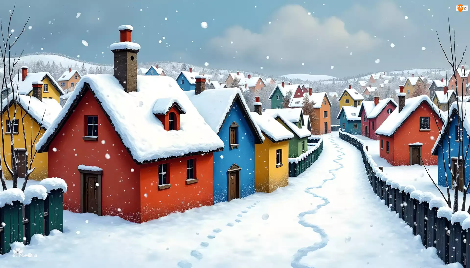 Ulica, Grafika, Domy, Kolorowe, Zima