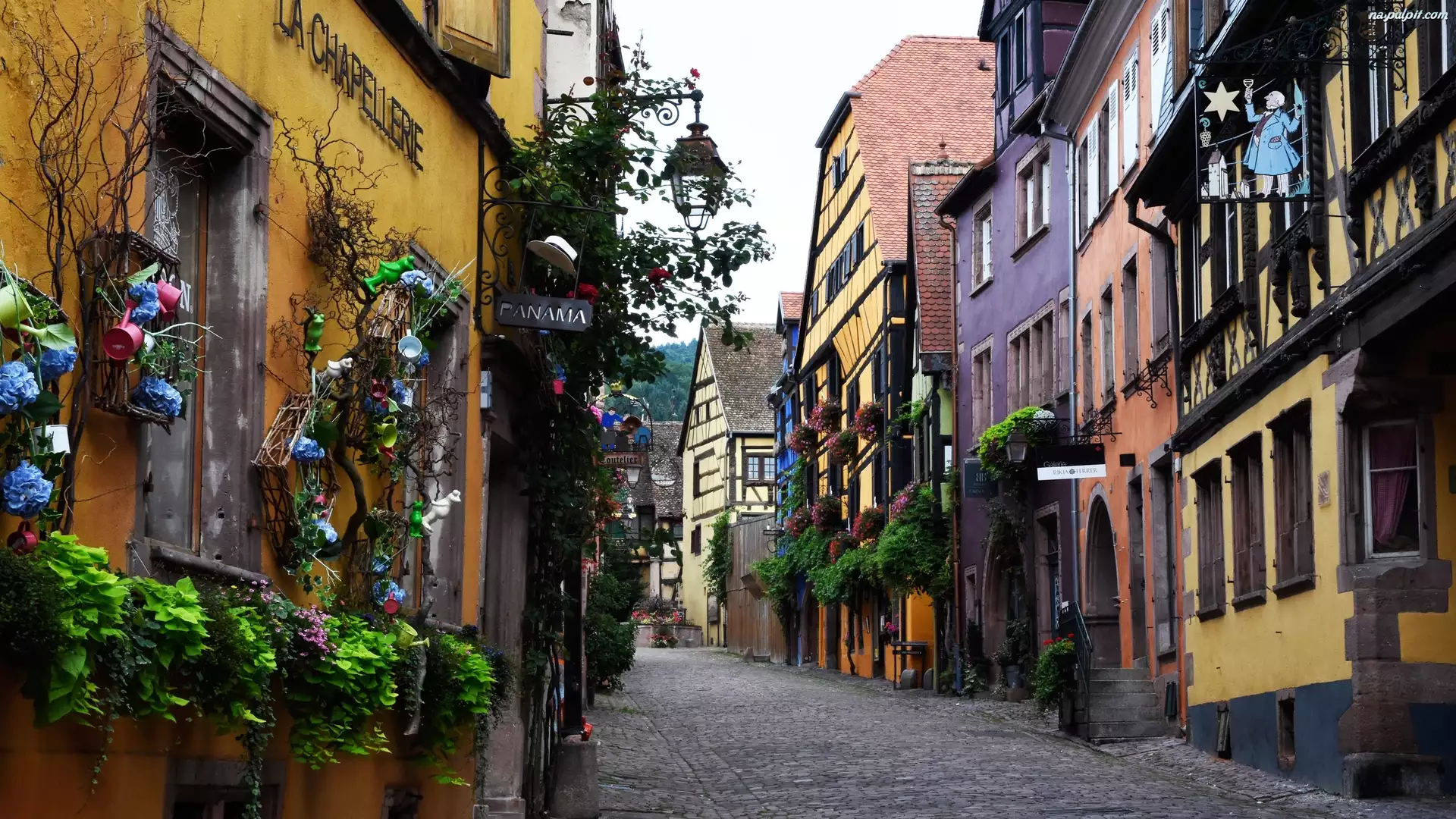 Kamienice, Kwiaty, Riquewihr, Francja, Uliczka