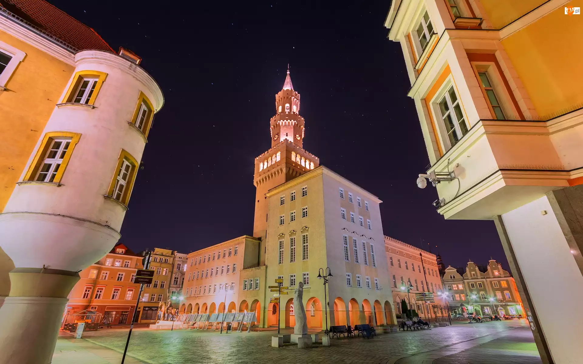 Opole, Polska, Ratusz, Noc, Rynek, Domy