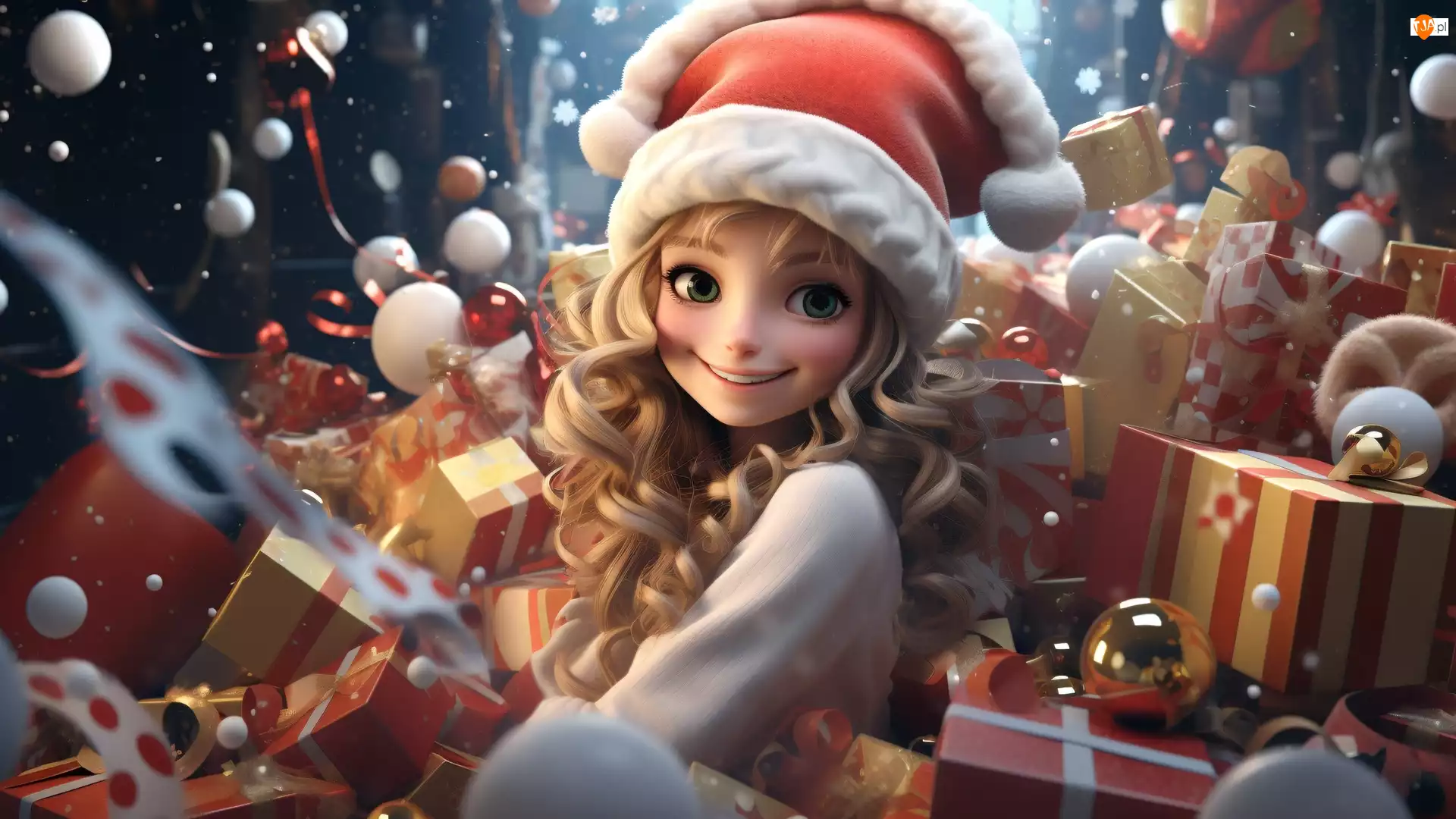 Uśmiech, Dziewczyna, Bombki, AI, Prezenty, Czapka