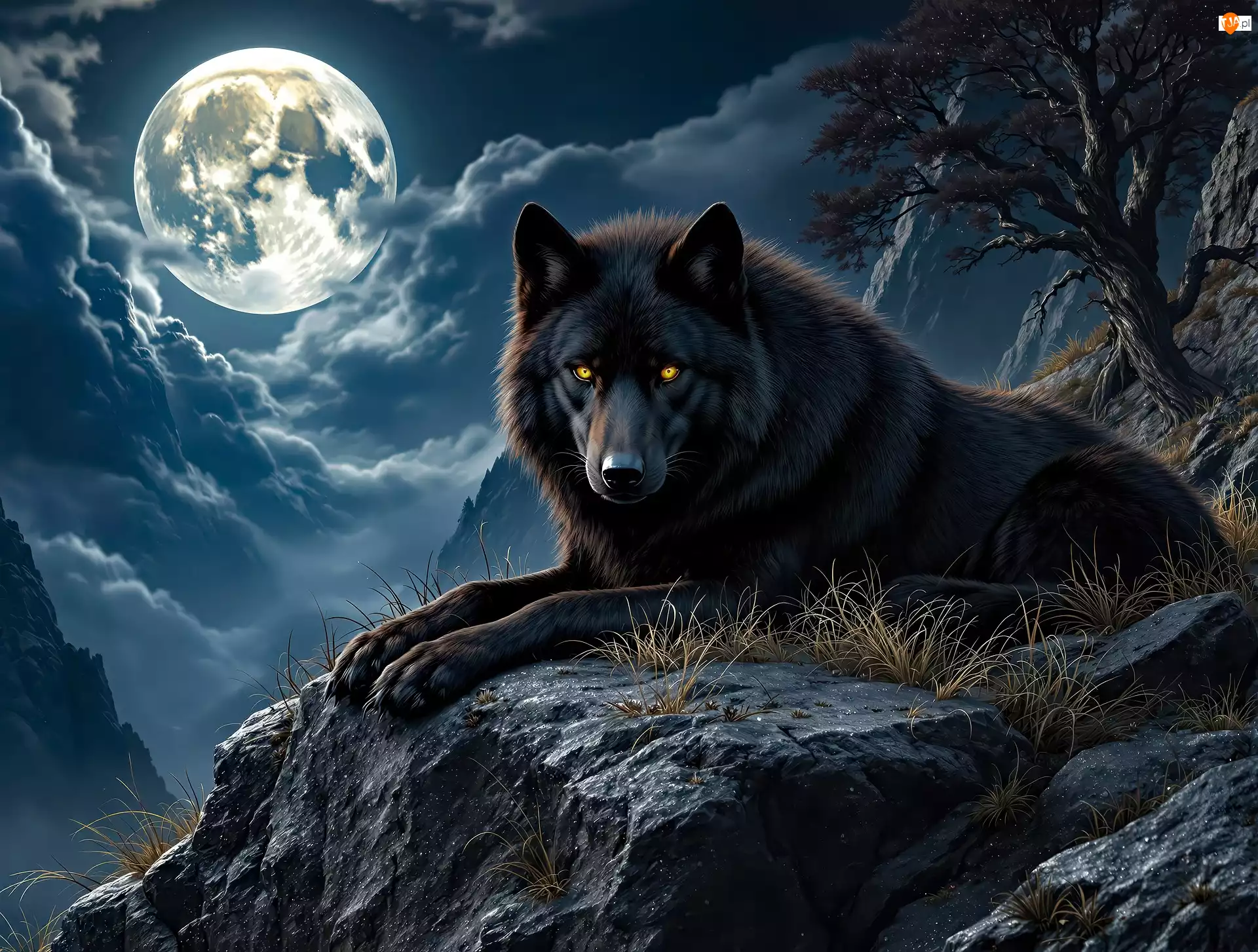 W świetle księżyca wilk czarny leżący na kami