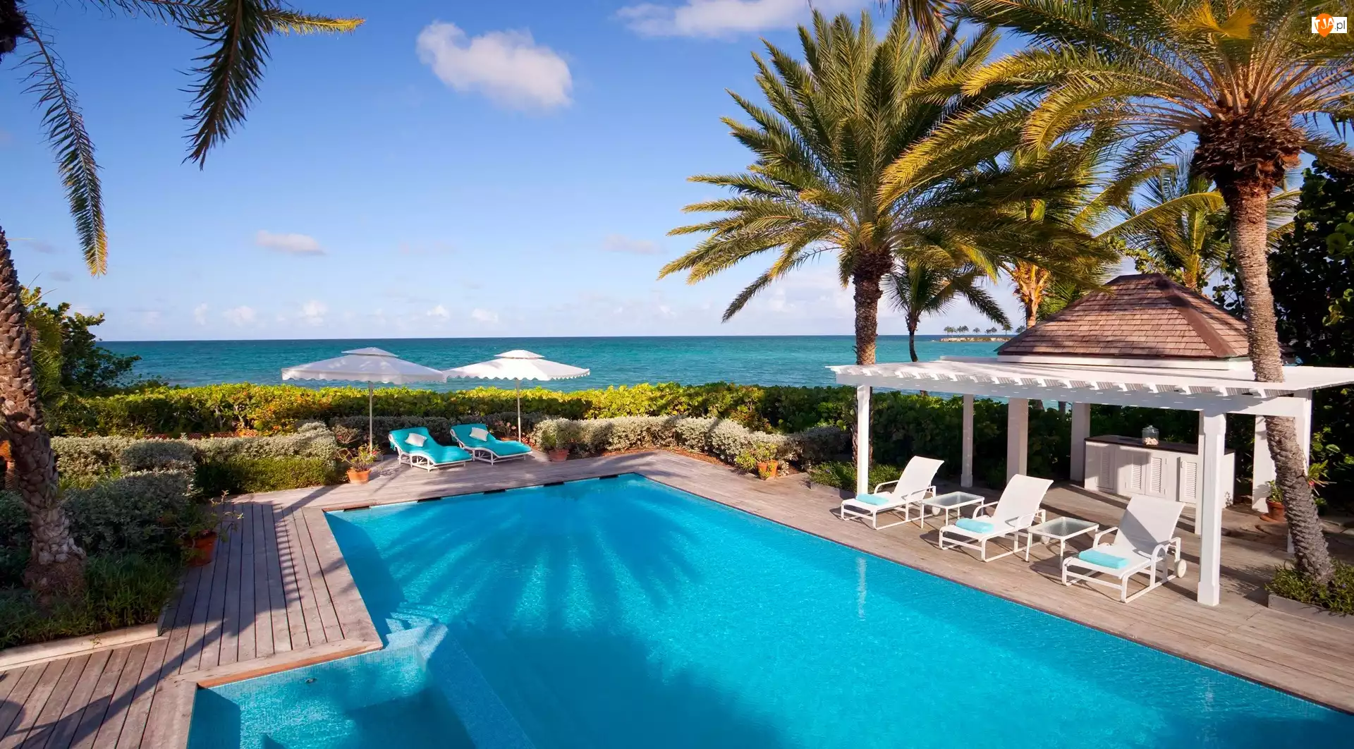 Wakacje, Basen, Palmy, Leżaki, Morze