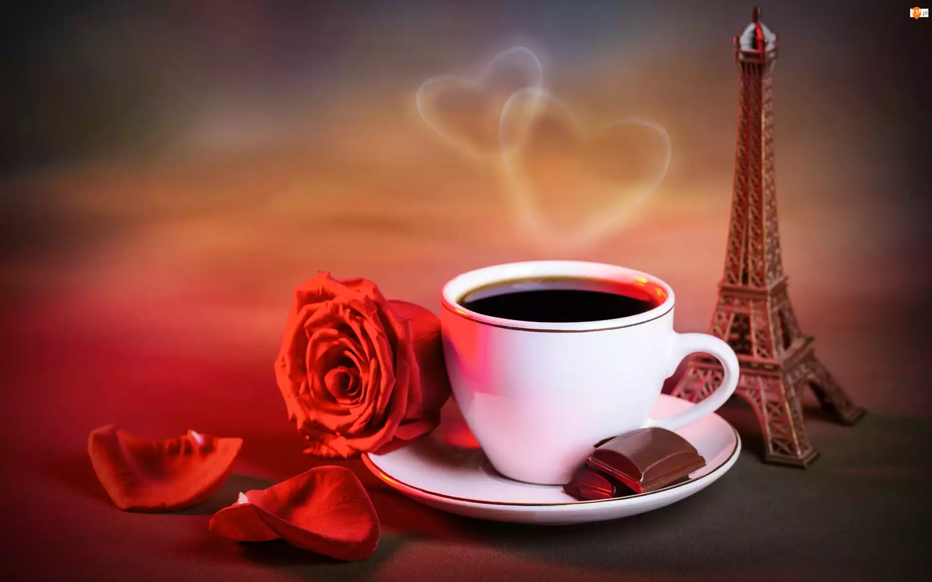 Walentynki, Serduszka, Kawy, Filiżanka, Kompozycja, Róża, Wieża
