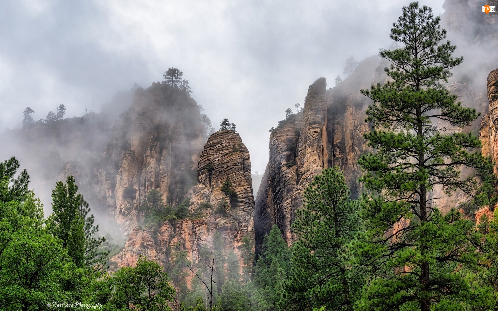 Arizona, Wąwóz, Drzewa, Stany Zjednoczone, Mgła, Skały, Oak Creek Canyon