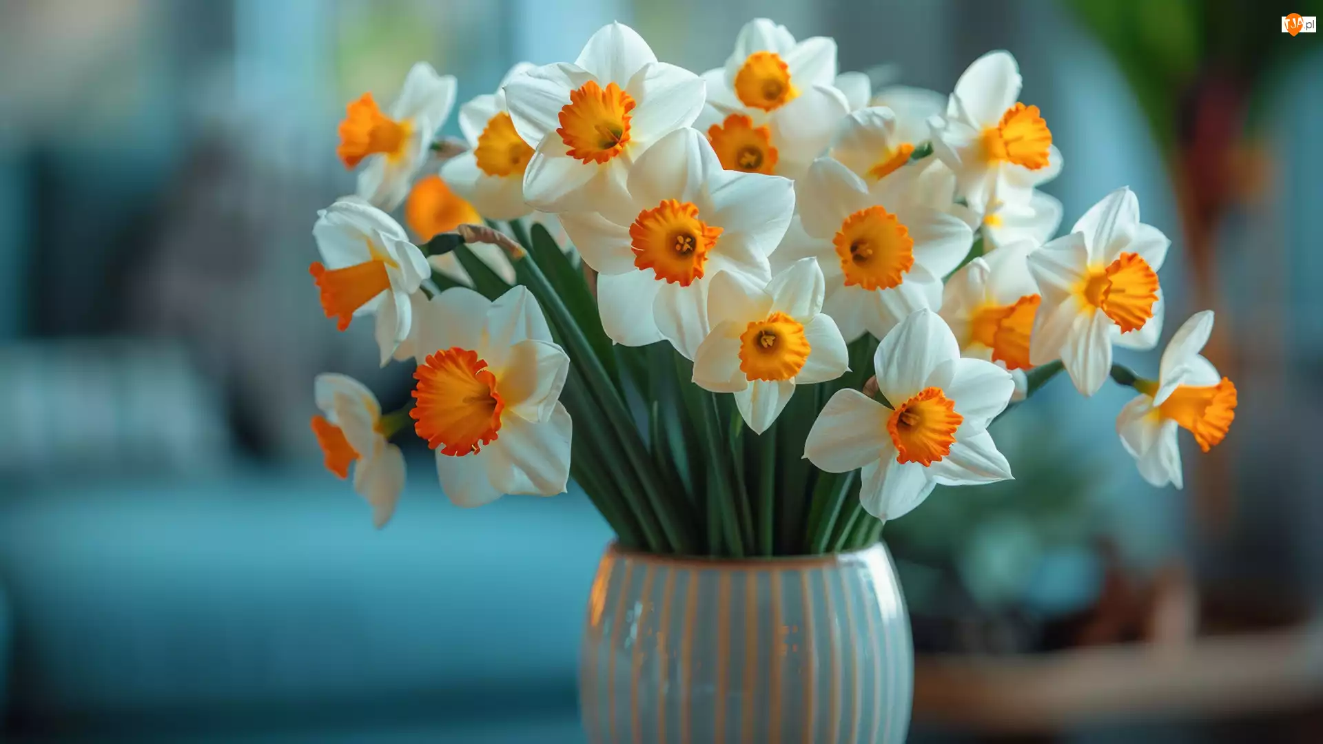 Wazon, Biało-pomarańczowe, Kwiaty, Narcyzy