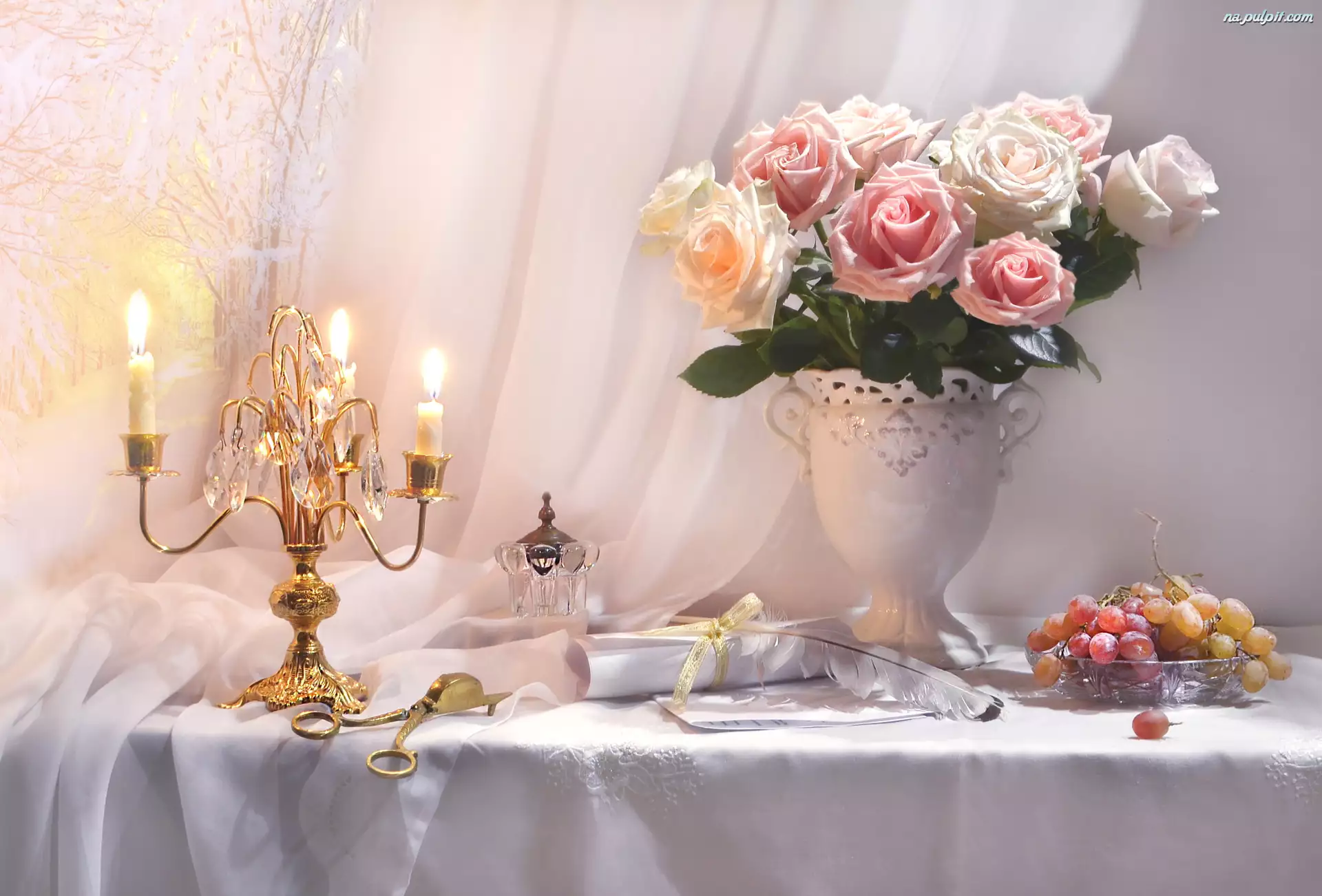 Wazon, Bukiet, Winogrona, Kompozycja, Świece, Świecznik, Róże