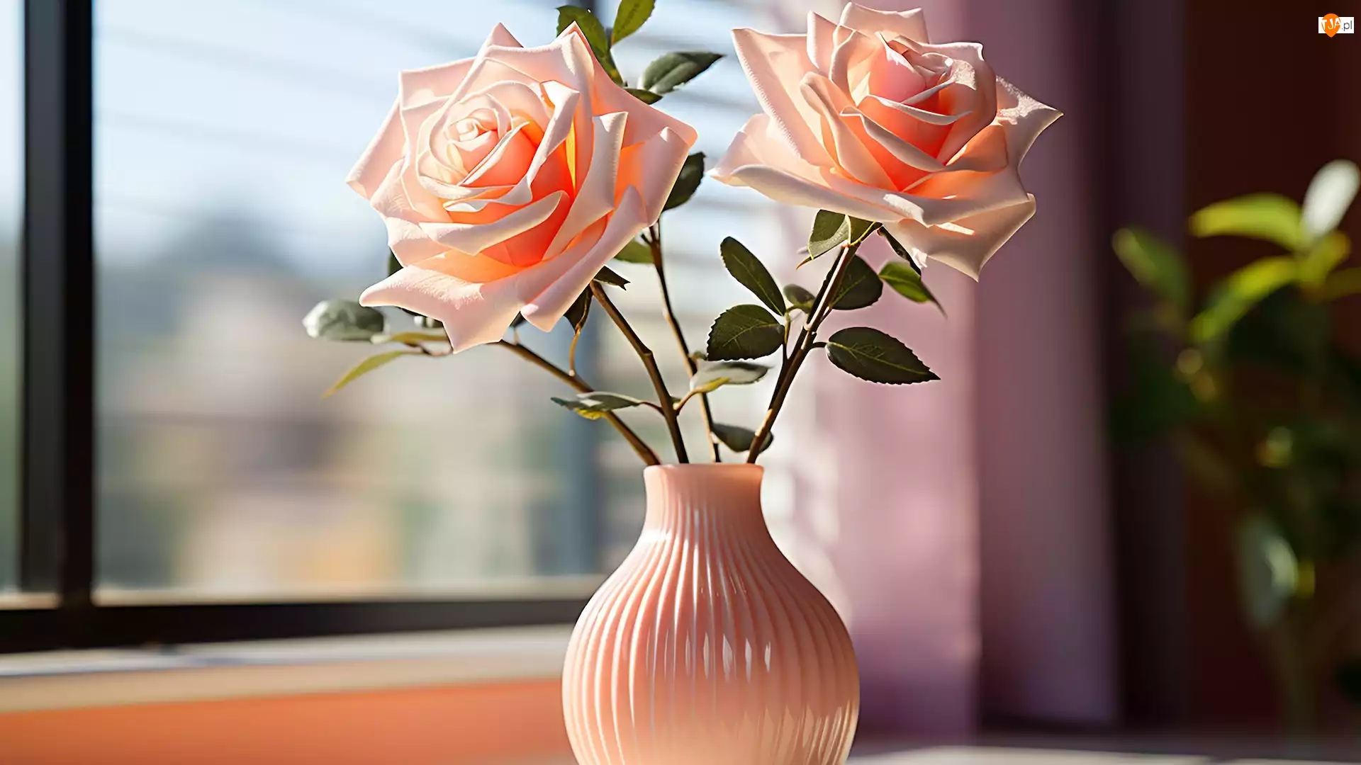 Wazon, Okno, Róże, Kwiaty, Grafika