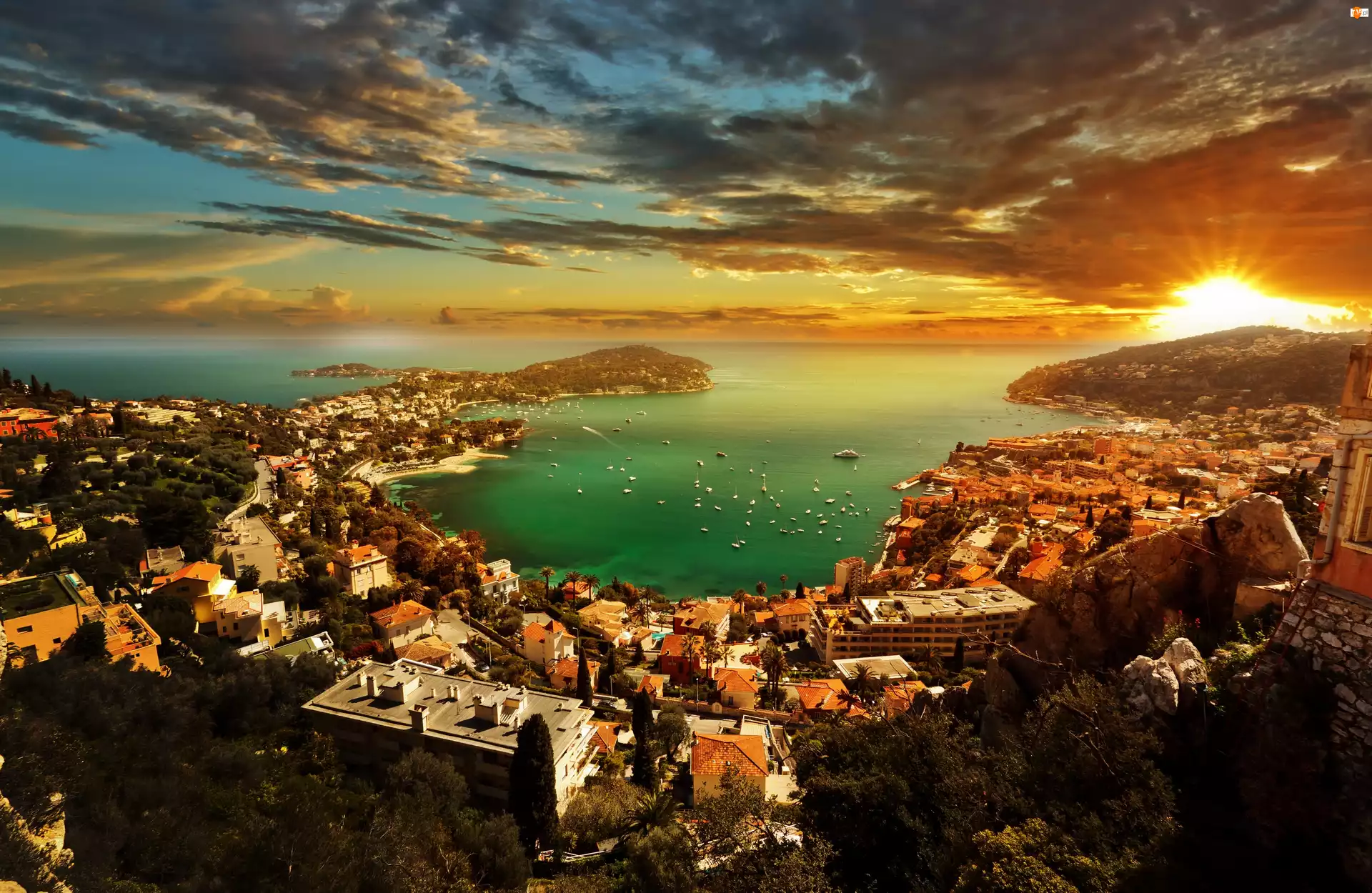 Chmury, Morze Śródziemne, Statki, Villefranche-sur-Mer, Półwysep Cap Ferrat, Francja, Lazurowe Wybrzeże, Budynki, Wschód słońca